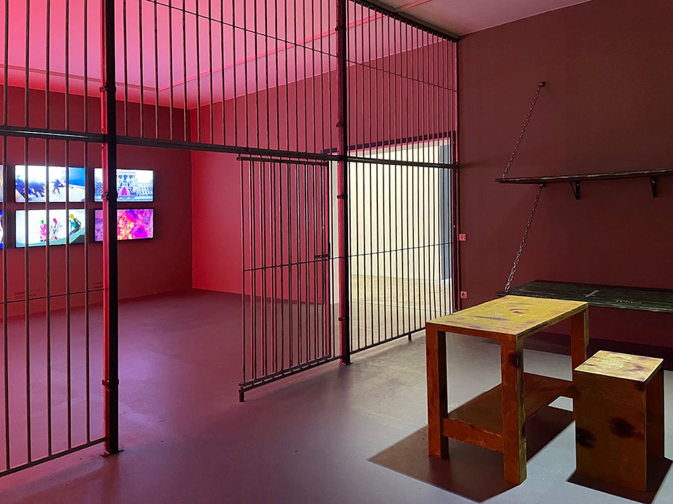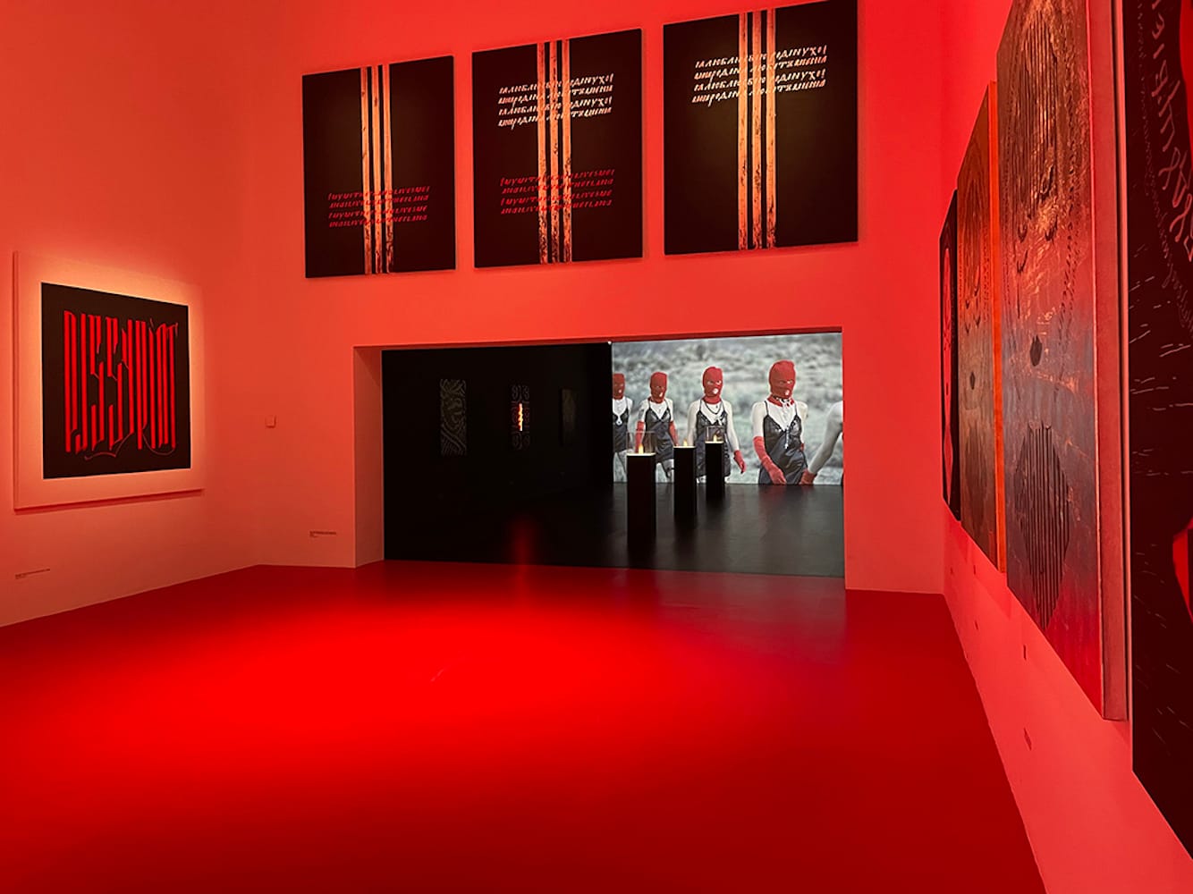 RAGE at OK Linz is Tolokonnikova’s first solo museum show to date. In paintings and engraved wooden reliefs containing text written largely in medieval Cyrillic vyaz calligraphy, the stark chromatic language of red and black speaks directly to violent political repression. Through their repetitive, prayer-like invocations, they draw on the psychological ordeal of the artist’s two-year incarceration and the defiance required to reclaim her artistic agency. One of the rooms features a reconstruction of her bleak prison cell with original letters and photographs; on the opposite wall, video screens play clips of the celebrated feminist collective’s performances and actions.