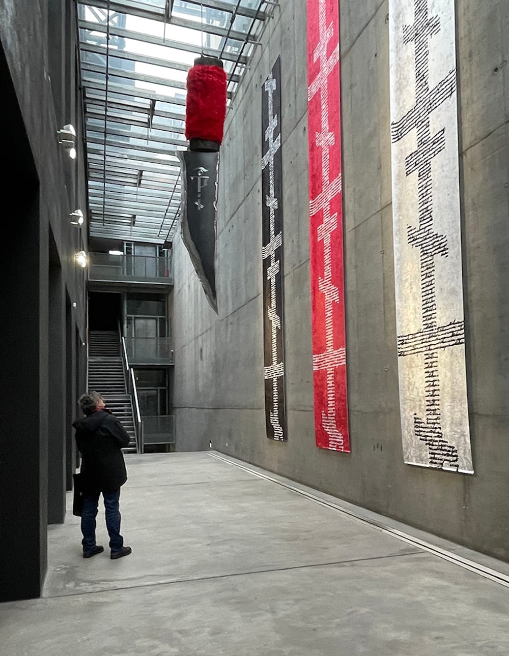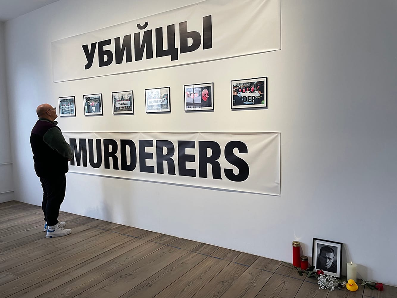 Some of the words in Tolokonnikova’s paintings are taken from her closing statement in court prior to sentencing; the works also include lyrics to the song “Rage,” which she wrote following Alexey Navalny’s imprisonment. Her giant “Damocles Sword,” dedicated to the political opposition figure, is a four-meter-tall (∼13-foot) knife blade that hangs over visitors’ heads, calling to mind the precarious situation of artists and activists in Russia and abroad living in constant danger of targeted persecution. An adjacent room features documentation from the protest piece “Murderers,” performed in Berlin by a group of balaclava-masked Pussy Riot members in outrage at Navalny’s death.