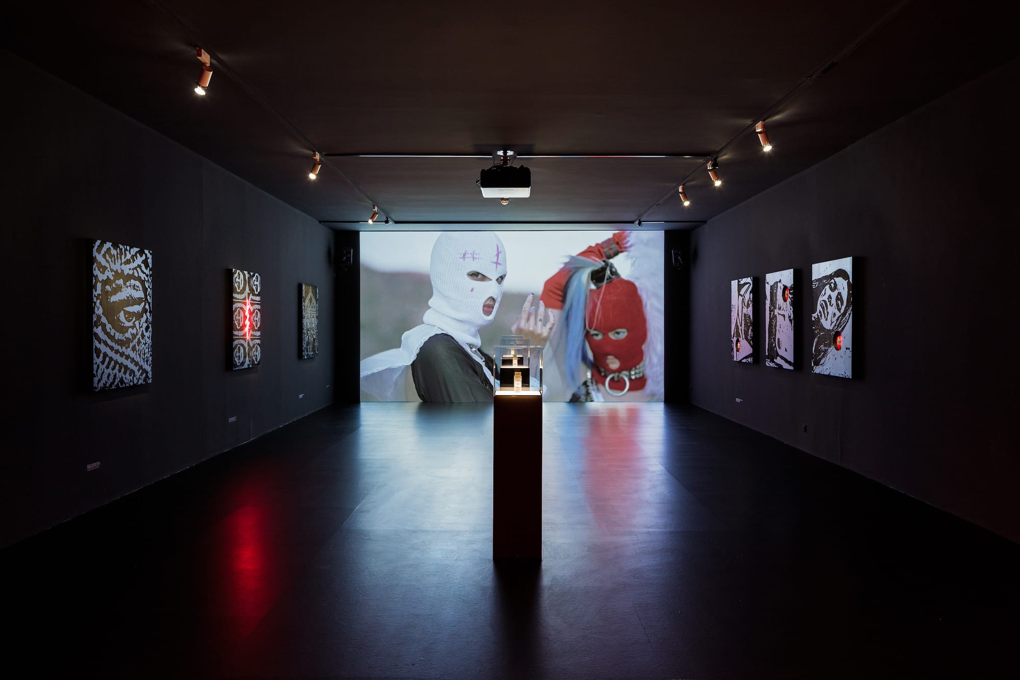 In a darkened room called the “Rage Chapel,” stylized portraits of Pussy Riot members line the walls like masked icons, with messages of rebellion hovering halo-like above their heads. “Fear is coming up again help me to chase it away” is an appeal from Tolokonnikova’s song “Panic Attack,” testifying to the anxiety of a young woman locked up in harsh conditions and the strength she managed to mobilize.
