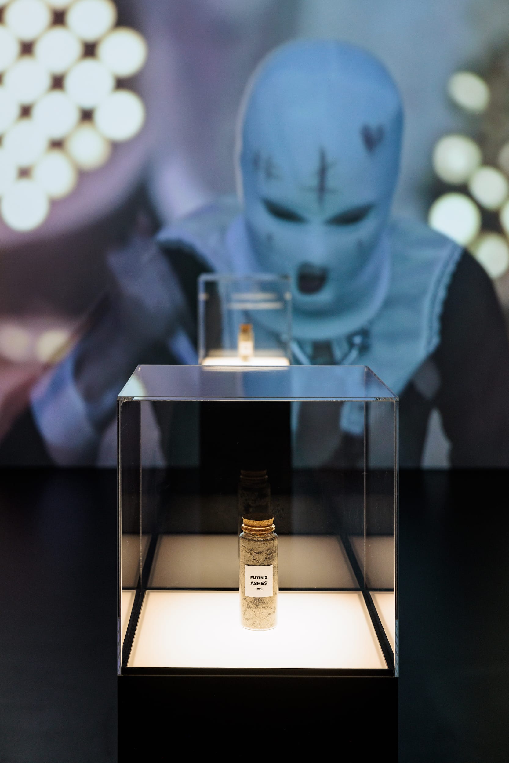 Tolokonnikova’s video “Putin’s Ashes” (2022) depicts the ceremonial burning of a large portrait of Vladimir Putin. It’s part of an installation titled “Putin’s Mausoleum,” in which small vials containing the ashes are displayed like relics; on the walls are wooden reliefs depicting the artist’s vulva and other images, collectively titled Dark Matter. Like the Pussy Riot Sex Dolls series — used sex toys in platform combat boots reconfigured as symbols of female empowerment and resistance — the pieces embody an aggressive feminist strategy aimed at ridiculing male power and patriarchal structures everywhere, and they led to her renewed arrest in Russia, this time in absentia. In light of the recent act of vandalism against the Austrian exhibition, the message that emerges is not merely the force of resistance and resilience, but the danger of retribution.