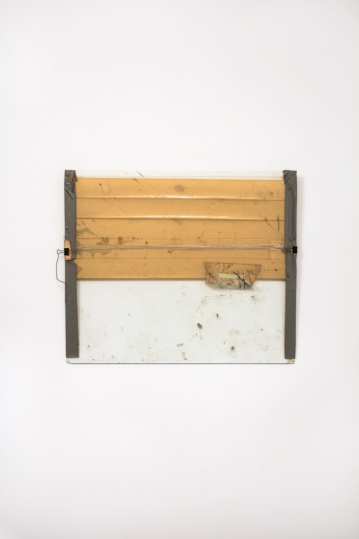 Although Tevet’s original intention was to hold a drawing between two pieces of glass, he soon realized that this minor technique could turn into a larger project, one that exists for no other purpose than its material being. The premise is straightforward: What do you need to temporarily preserve and mount a drawing on the wall? If “Untitled #1” (1972) offers a clue, you need two pieces of glass and binder clips and whatever you choose to be kept between the transparent panes. You may also need some masking tape, transparent tape, and marker. In his essay, de Duve cites Tevet: