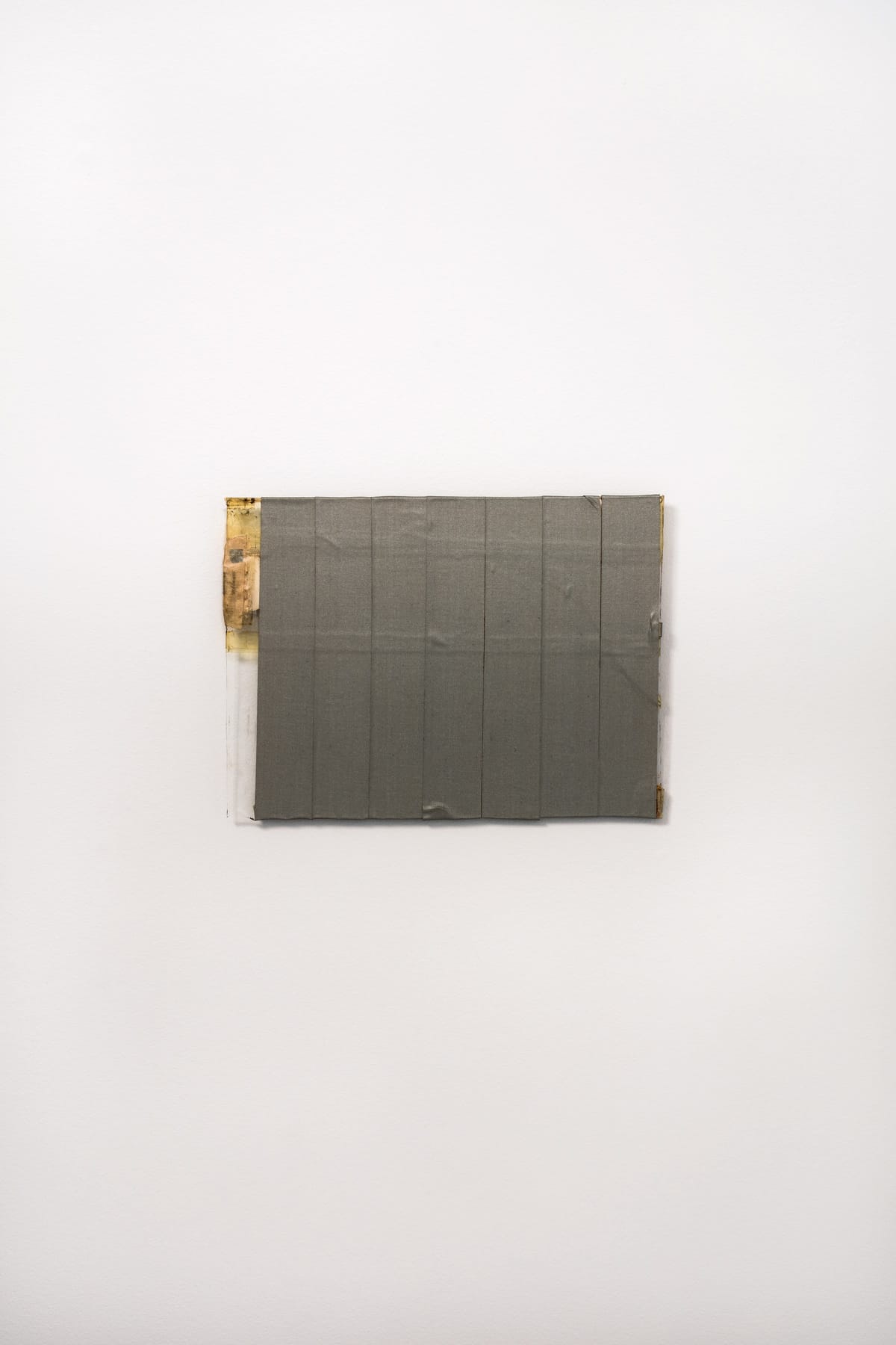 The “Works on Glass” are dry and absurd. When Tevet uses a lot of duct tape to secure the binders to the glass, you get the sense that these materials sometimes required the artist to take the long way around to do the simplest things. When I encountered pieces in which I could not look through the glass to the wall because much of it was blocked by cardboard, paper, or tape, I wondered how much this sense of overprotection, as it were, had to do with living on a kibbutz in a perilous situation. What about borders — the visible and invisible ones we all have to negotiate? How, for example, did these works justify their existence without relying on older historical models of painting and sculpture? Doesn’t this sui generis concept evoke the state of Israel’s existence? Doesn’t the tape, both large and small, which is used as a means to simultaneously secure and obscure, suggest as well as deny the dangers that lie ahead? Equally important, these works get you to think about what you can and cannot see.