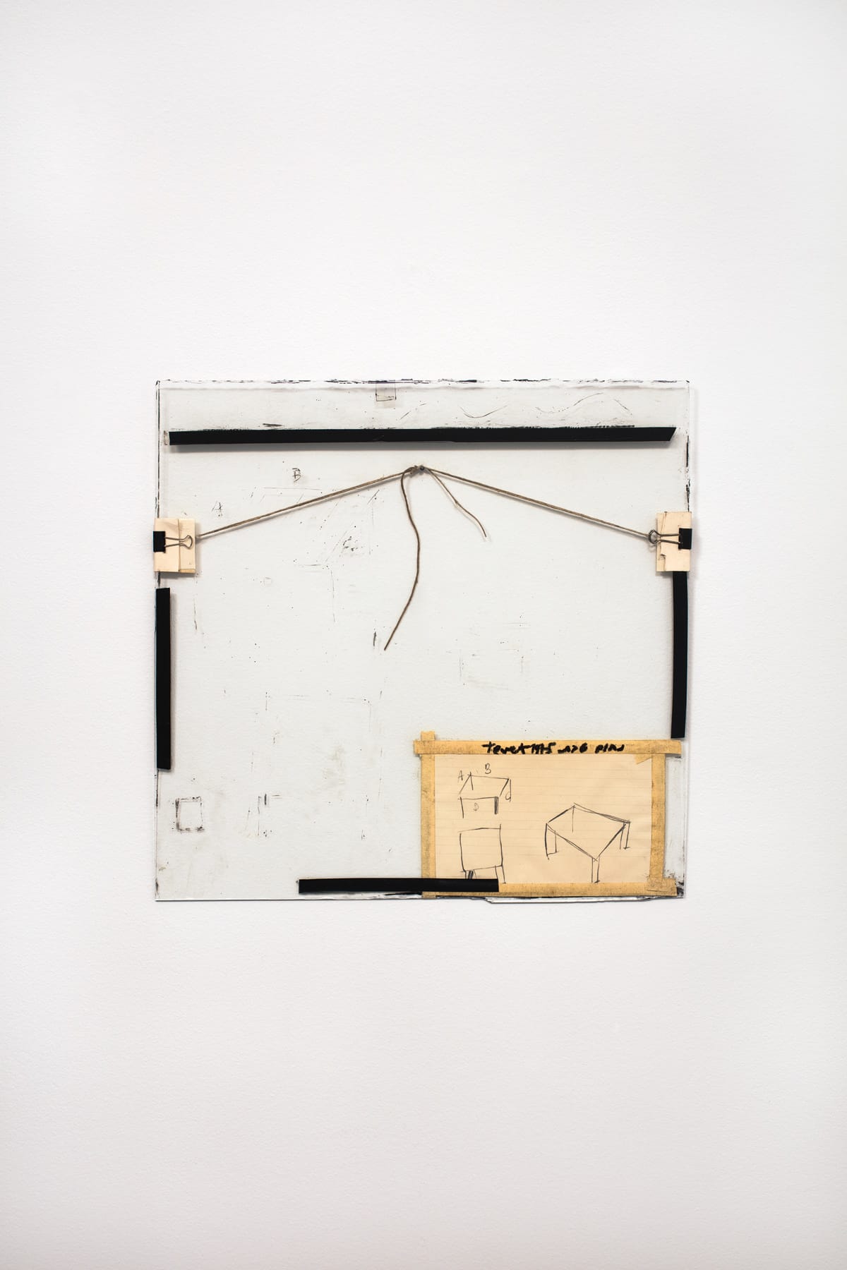 Some ingenious things happen. Tevet threads the binder clips with string or wire, which enables him to hang the work on a wall. Meanwhile, the twine forms a pentagon stretched across the glass panes, as in “Untitled #3 (1972), or an inverted triangle, as documented in the photograph of “Untitled #4” (1972) reproduced in the catalogue. We look through the glass, which reveals what holds together the drawing before our eyes. Instead of lamenting that art cannot offer transcendence or sanctuary, Tevet celebrates it with wry humor.