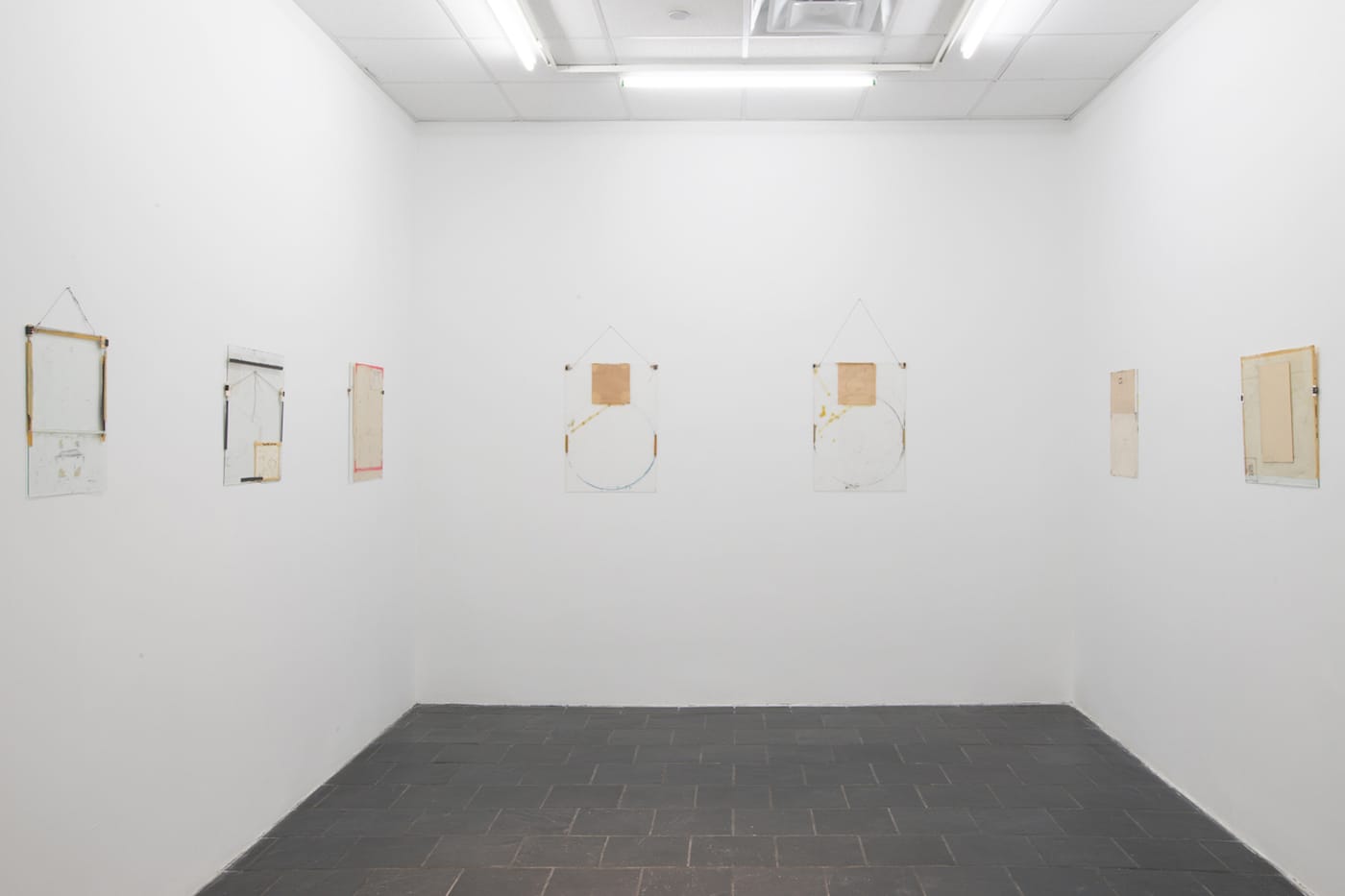 Nahum Tevet was born in Israel in 1946, and began making his “Works on Glass” in 1972 while he was living on a kibbutz. These modest assemblages of paper, tape, cardboard, and glass didn’t start out as a series. Rather, Tevet embarked on them as an inexpensive way to frame a drawing and bring it from the studio to a room where he could sit and ponder it. I don’t think you need to know a lot more about the process because — by looking at Tevet’s “Works on Glass” — you will learn the story of what it takes for a selection of found objects to become a work of art, or what Donald Judd called a “specific object,” which he declared “needs only to be interesting.” That is one of the many fascinating features of the exhibition Nahum Tevet: Works on Glass 1972-1975, currently on view at Hunter College’s Bertha and Karl Leubsdorf Gallery (September 22–November 20, 2016).