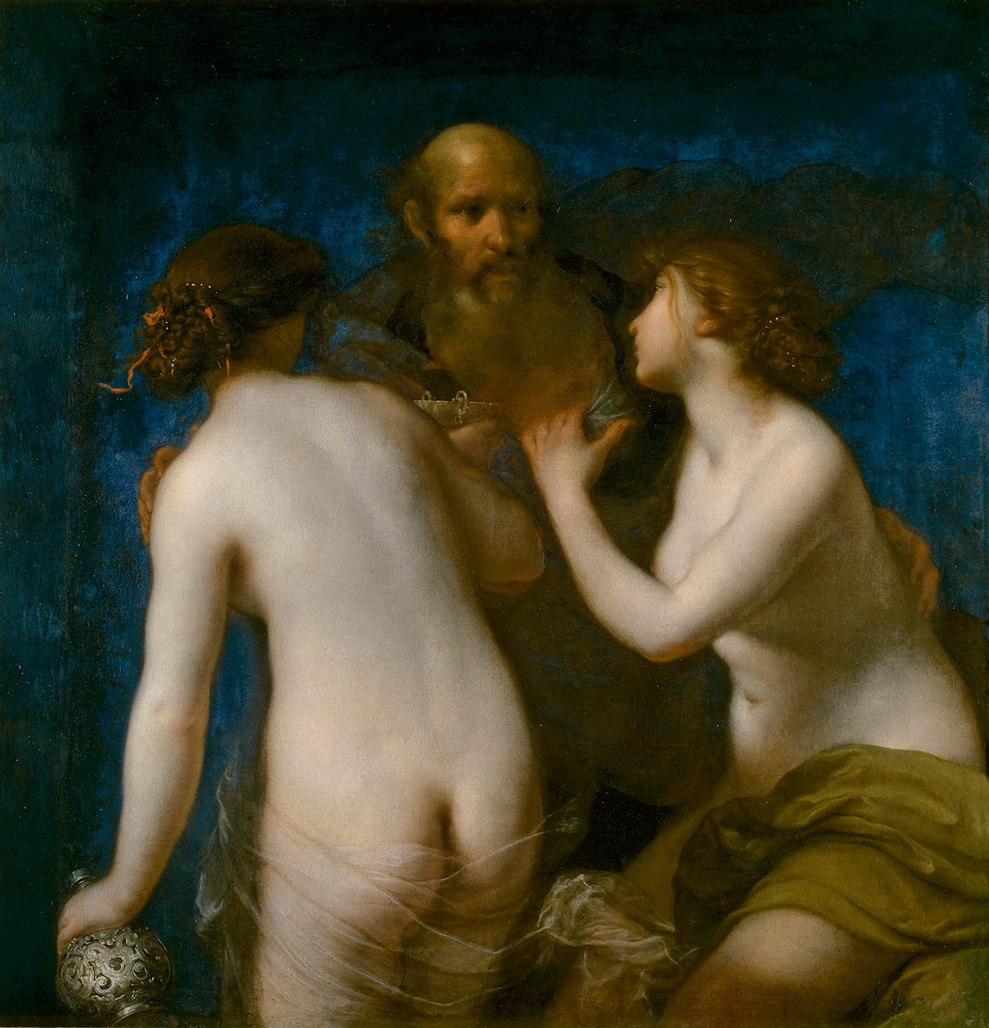 In Francesco Furini’s “Lot and His Daughters” (c. 1634), for instance, nudity drives Lot to override the taboo against incest. His daughters, seeing the destruction of Sodom and Gomorrah, concluded that they were the last people on earth and that to continue the human race, they must get pregnant by their father. Painted in a refined, brushy manner inspired by Titian’s midcareer technique, their smooth and glowing backs to the viewers, the daughters overwhelm Lot’s better judgment. (The painting was a gift to Philip IV at the wedding to his niece, Mariana of Austria, from the Grand Duke of Tuscany – was it a jab or commiseration about the burdens of continuing a lineage?)