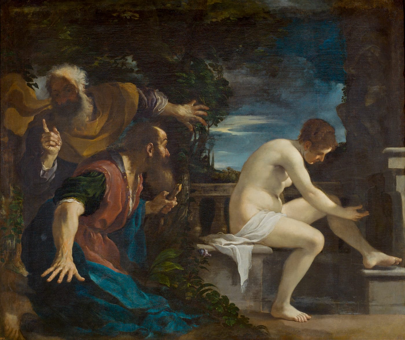 Guercino’s “Susannah and the Elders” (c. 1617) offers a reverse dynamic to the sexual aggression of Lot’s daughters: here, the virtuous Susannah bathes innocently at a fountain, her flesh illuminated by a pale light. On the left of the painting, two elders, who will subsequently tell her to have sex with them, or else they will tell everyone that she has had sex with them, can barely contain their excitement at the sight of her. One leans into the painting, grasping a gnarly, phallic branch to support himself as he looks; the other leans forward, face cast in shadow, left hand grasping towards Susannah, the other towards the viewer. His right index finger is raised, connoting both his desire for her and warning to us. The men’s response models our own: astonishment at the power and beauty of Guercino’s artful nude.