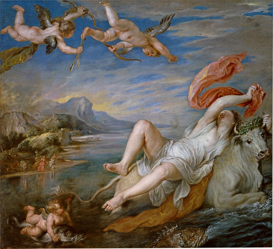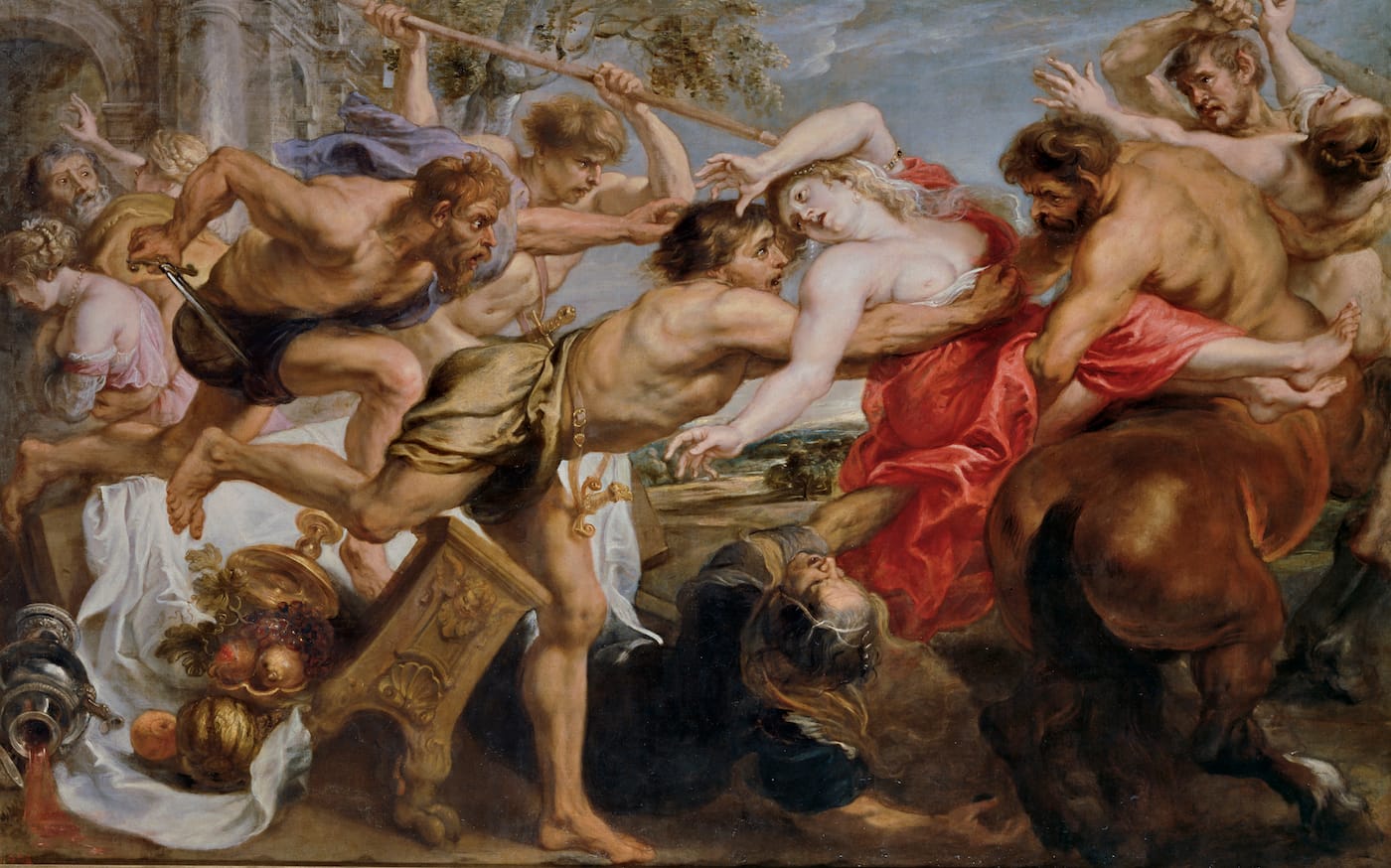 Luckily, the rest of the artists interpret Titian’s legacy much more interestingly than did Titian in this instance. This is most overt in Pieter Paul Rubens’s radiant, to-scale copy of Titian’s “Rape of Europa” from 1628–29 (you can drive back and forth between it and the original, in the Gardner Museum in Boston, to compare). In his “Rape of Hippodamia” (1636–38), Rubens adopts Europa’s figure type but makes her abduction by Jupiter look like a ferry ride in comparison: Hippodamia is pulled between pillaging centaurs and her vengeful relatives, the red satin drape at her midriff suggesting both her contested genitals and a rip in her flesh as she is torn between them.