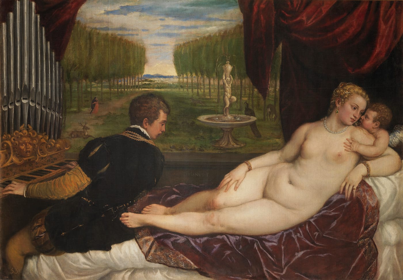 The Spanish royal taste for nudes can hardly be separated from the Spanish royal taste for Titian, the Venetian painter who innovated the influential, seductive nude Venus-type that the two Philips avidly acquired. The most famous of Titian’s works that still remain at the Prado – “Danaë,” “Venus and Adonis,” “Adam and Eve,” “Bacchanal of the Andrians” – did not join the party in Williamstown. Titian haunts the exhibition nonetheless, foremost in “Venus and an Organist” (c. 1550–55), plodding and smudgy, signed by the artist but without a sense of his touch, the chief amusement of which is the organist’s fixed gaze at Venus’s marmoreal crotch.