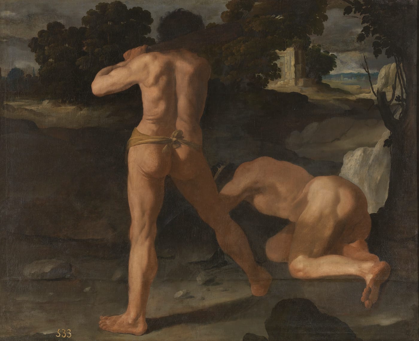 These works offer a striking contrast to Rubens’ paintings. So worldly, learned, and versed in classical composition and anatomy, Rubens offers a nearly frictionless viewing experience. Zurbarán, by contrast, brought in from provincial Seville by his old friend Velázquez for this commission, delivers a distinctly idiosyncratic vision of the heroic narrative: in his “Hercules Defeats King Geryon” (1634–35), Zurbarán not only confers his subjects with unusual anatomy, he also poses them so that we can see neither man’s face. Our affective connection to the painting instead must come through imagining the weight of Hercules’s club on his shoulder and his satisfaction as he surveys the defeated King Geryon, face down before him – or through understanding the emotional expressiveness of male buttocks.