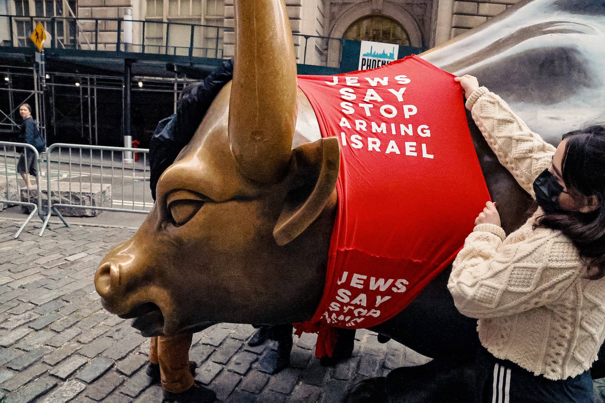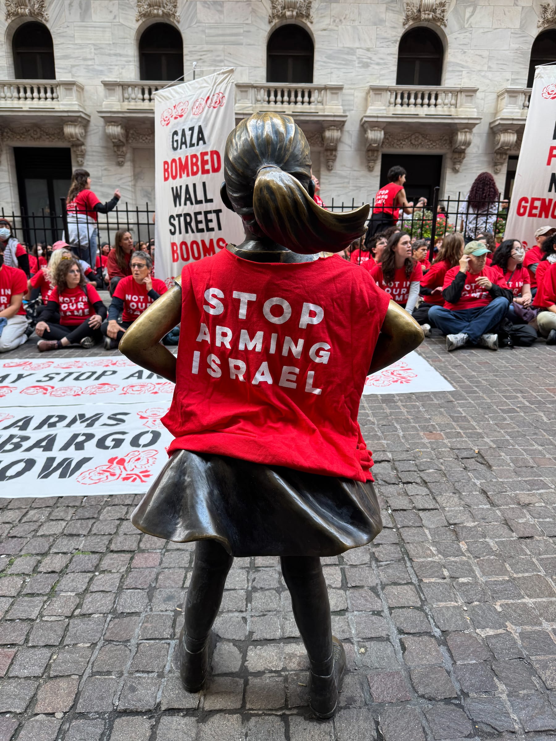 The action drew around 500 protesters, including descendants of Holocaust survivors, JVP said in a statement shared with Hyperallergic. Starting when the stock exchange's trading floors opened at 9:30am, activists wearing “Not In Our Name” t-shirts fitted the red garments over Wall Street’s famous “Charging Bull” (1989) and “Fearless Girl” (2017) bronze sculptures and unfurled banners that read “Gaza Bombed, Wall Street Booms,” “Stop Arming Israel,” and “Fund FEMA Not Genocide.”