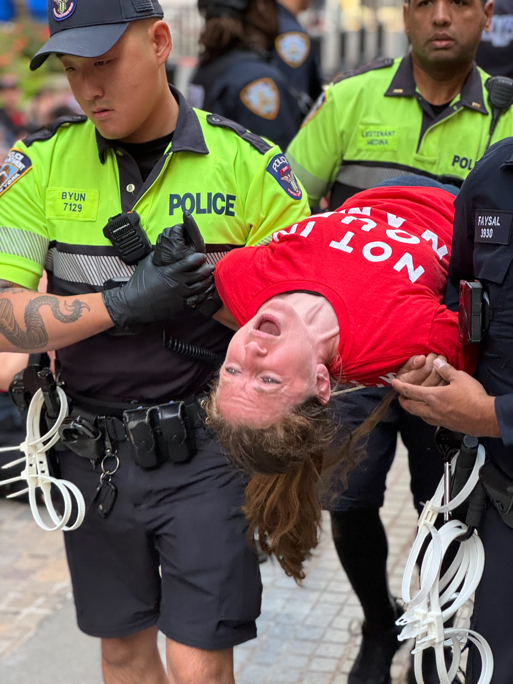 At least six activists also chained their bodies to the building’s main entrance gates. Photos and video from the action show police officers forcibly removing them from the site by carrying and dragging them away.
