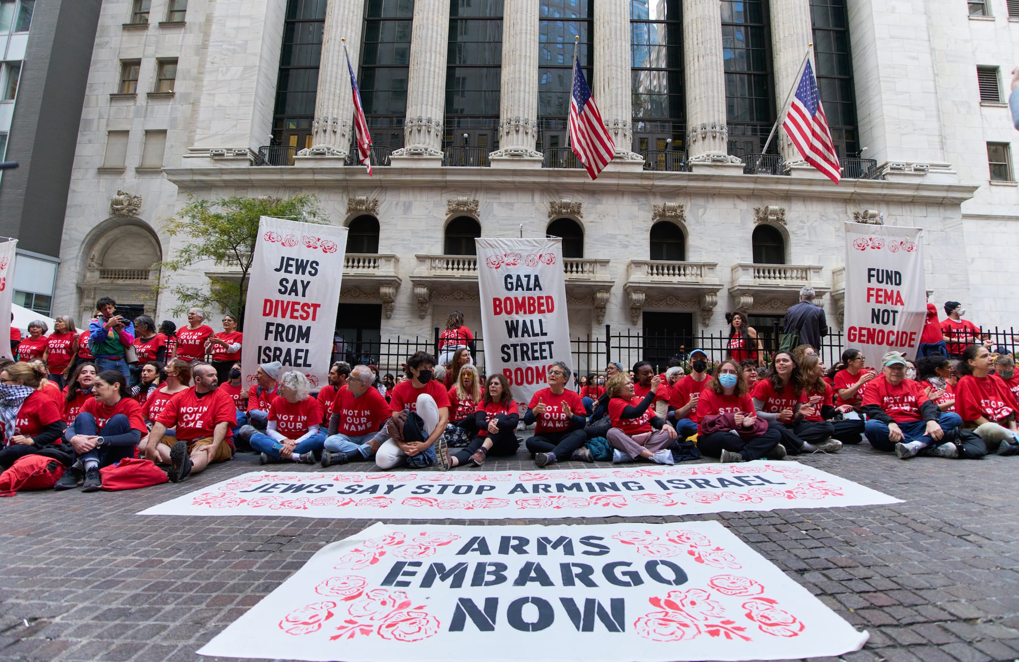 Over 200 activists with Jewish Voice for Peace (JVP), including artists Nan Goldin and Molly Crabapple and filmmaker Laura Poitras, were arrested for participating in a sit-in for Palestine outside the New York Stock Exchange yesterday, October 14. The action criticized the rising stock prices of weapons manufacturers such as Lockheed Martin, the biggest arms maker in the United States, amid Israel’s ongoing attacks against Gaza and Lebanon.
