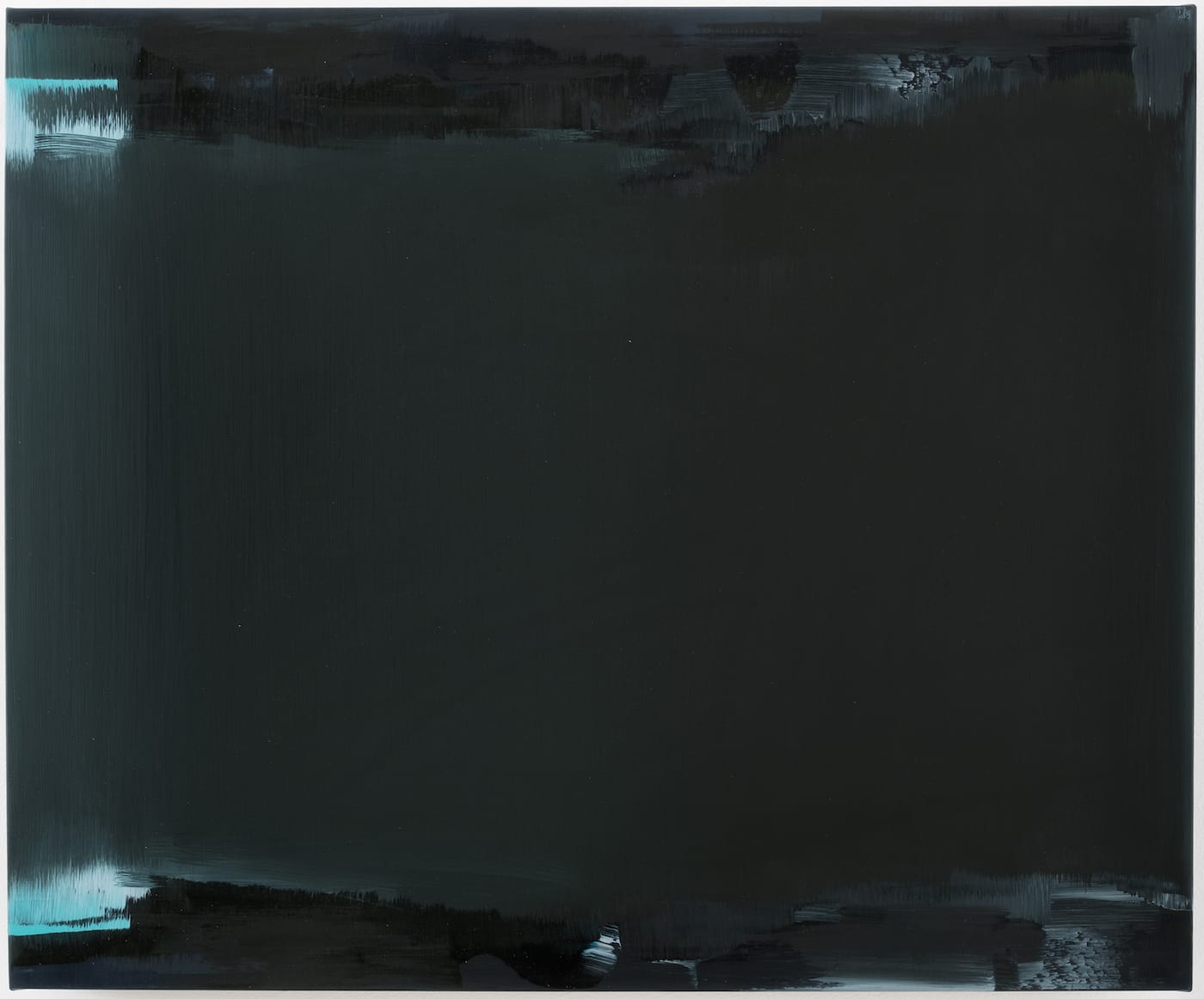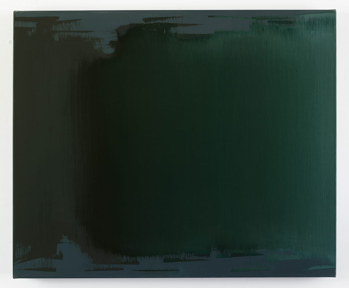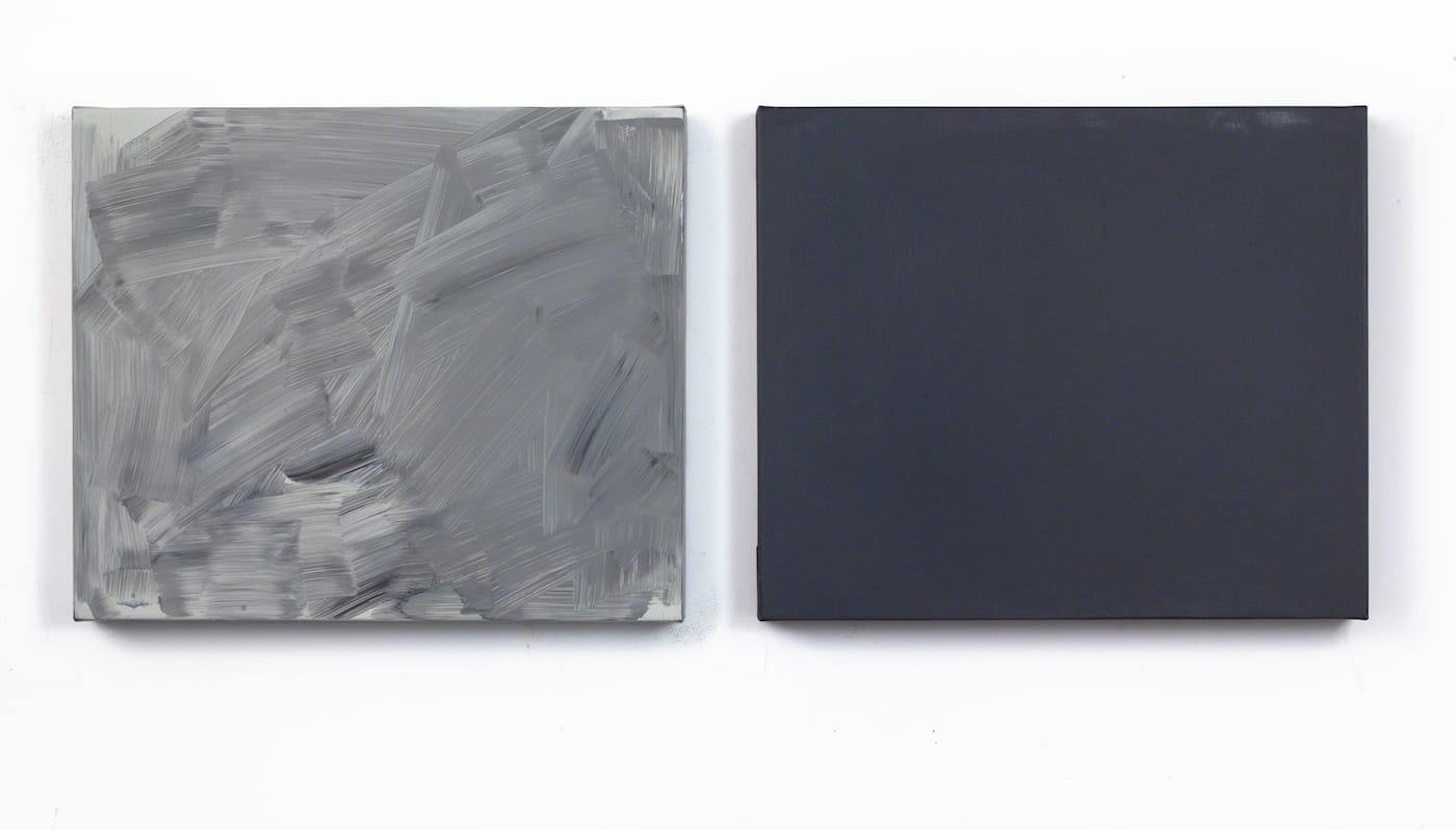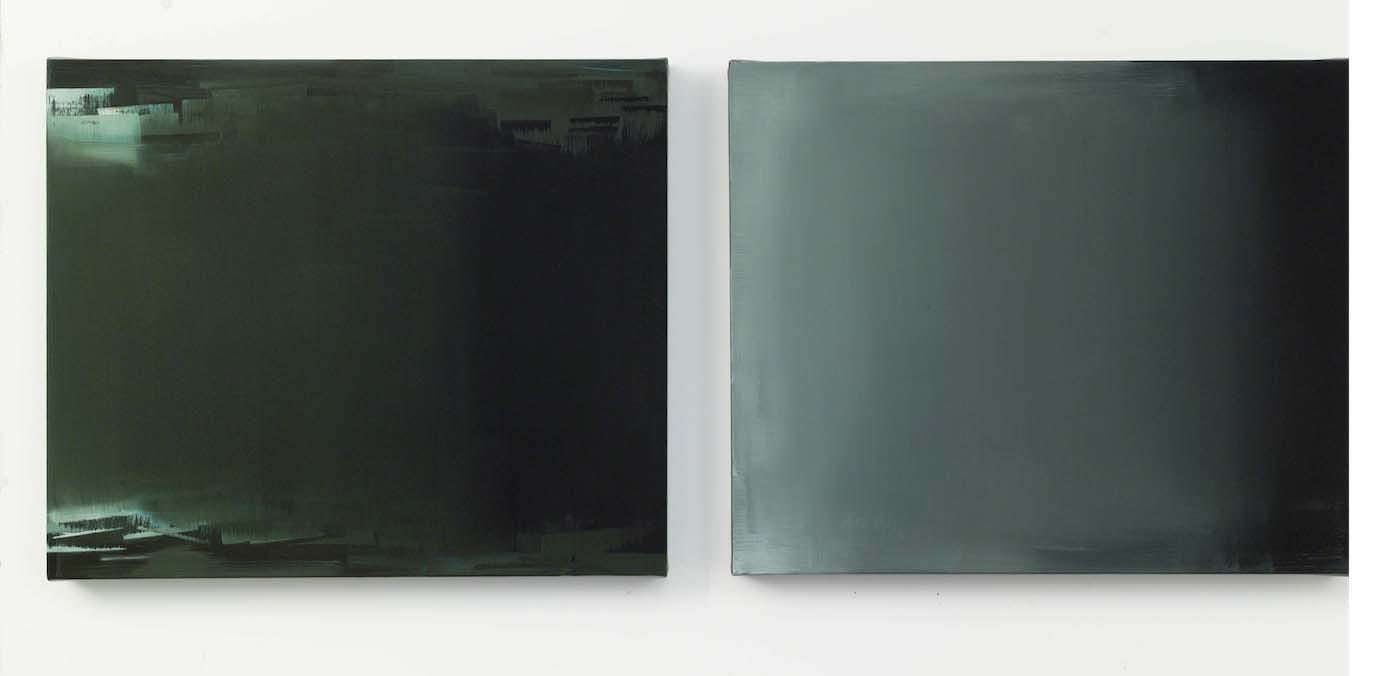 In each painting of the diptych, there is a subtle darkening from left to right. In the painting on the left, the brushstrokes ending near the paintings top left edge release a turquoise light, at once material and muffled. This occurs along the bottom left of the painting as well. The field between these glowing streaks gradually darkens as our eyes move to the right, a transition that feels inevitable. For a brief moment one might be reminded of a mist of condensation or a sheet of rain, but, in the end, the painting and painting take over. The movement of the brush and the pressure of application are evident. You cannot be sure if the brushstrokes were slow or fast, perhaps both. By covering the canvas, what is she uncovering? Questions and metaphors rise to the surface.