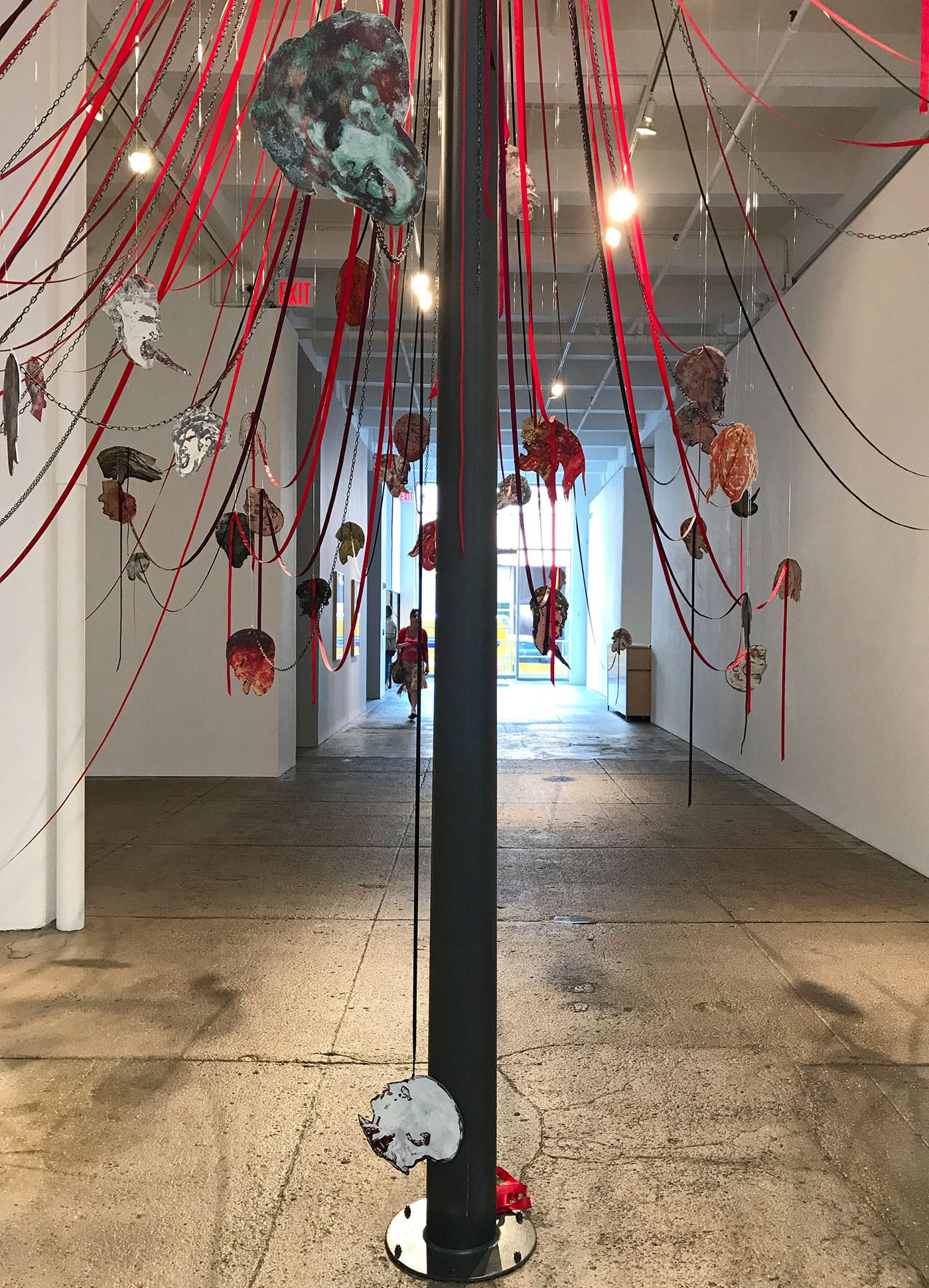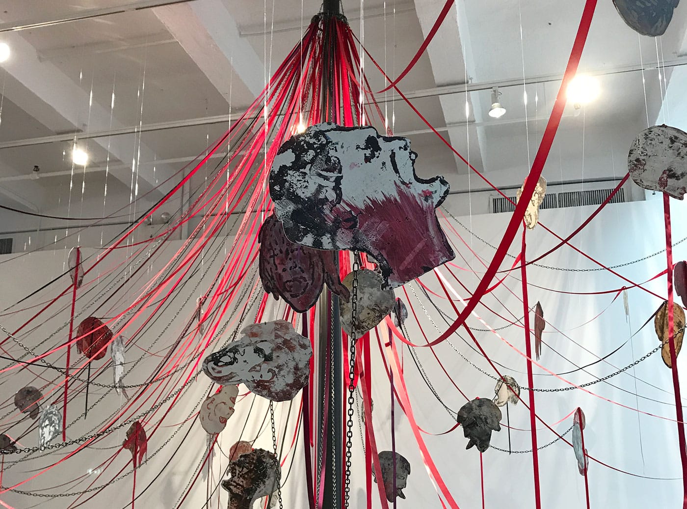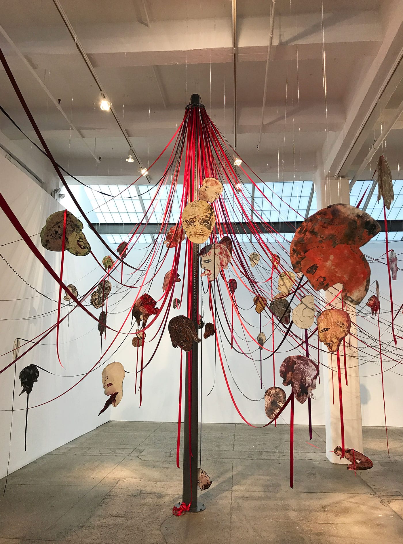 When Spero returned to her maypole idea, 40 years later, the Iraq War was raging. The United States was replaying its leading role as an agent of death and destruction. This time, Spero would literally build the pole and drape the ribbons and create the heads. The viewer would be forced to physically encounter and negotiate the spectacle of violence, which the work instantiates not only in its overall form, but also in the bright red resonance between the festive ribbons (accompanied by some chains) and the bloody heads. The faces, hand-printed on aluminum, have an aged, almost mythical quality to them (one seems to be bleeding from its eyes, like Oedipus), as if they’d been ripped from some decaying, ancient text. Yet their extended tongues and pained facial expressions make their agony seem visceral and real. Maypoles are traditionally erected for festivals that gather communities to celebrate spring or summer; historically, executions and lynchings have also been events that bring people together. What does it mean, Spero asks, for war to be a ritual? How do we confront the brutal fact that violence is part of who we are?