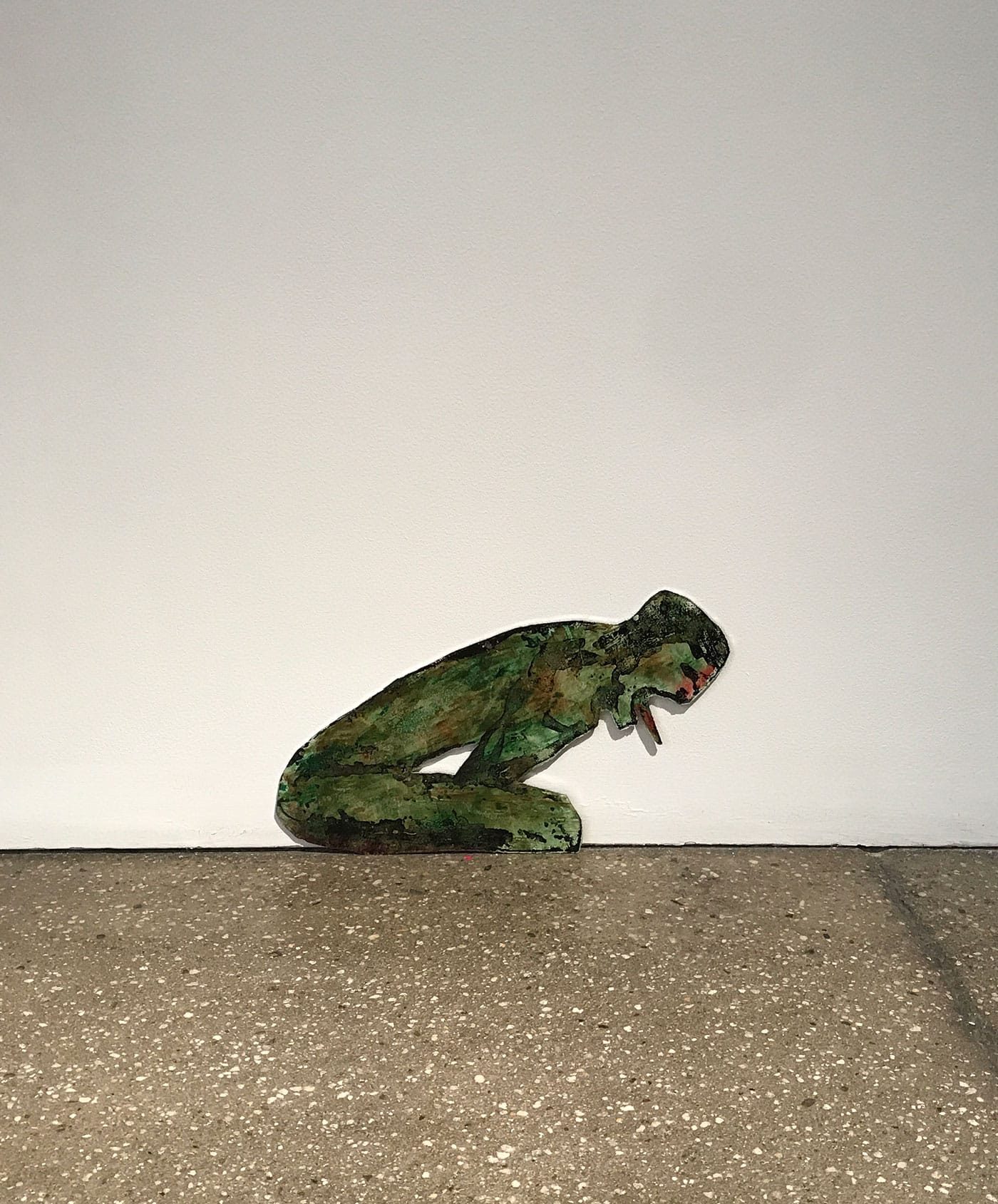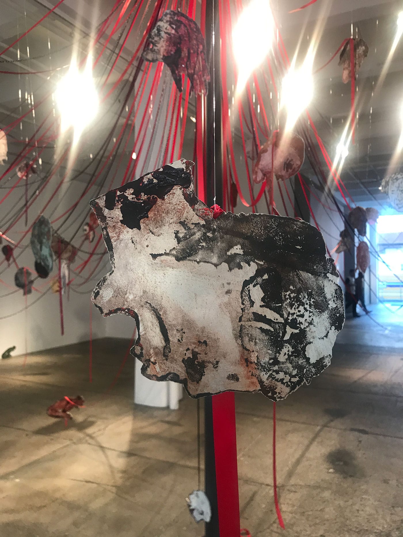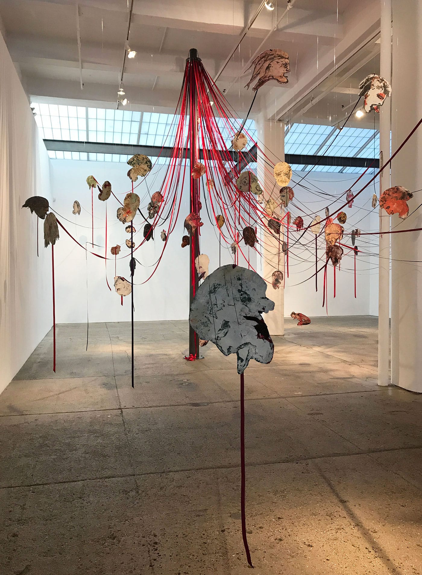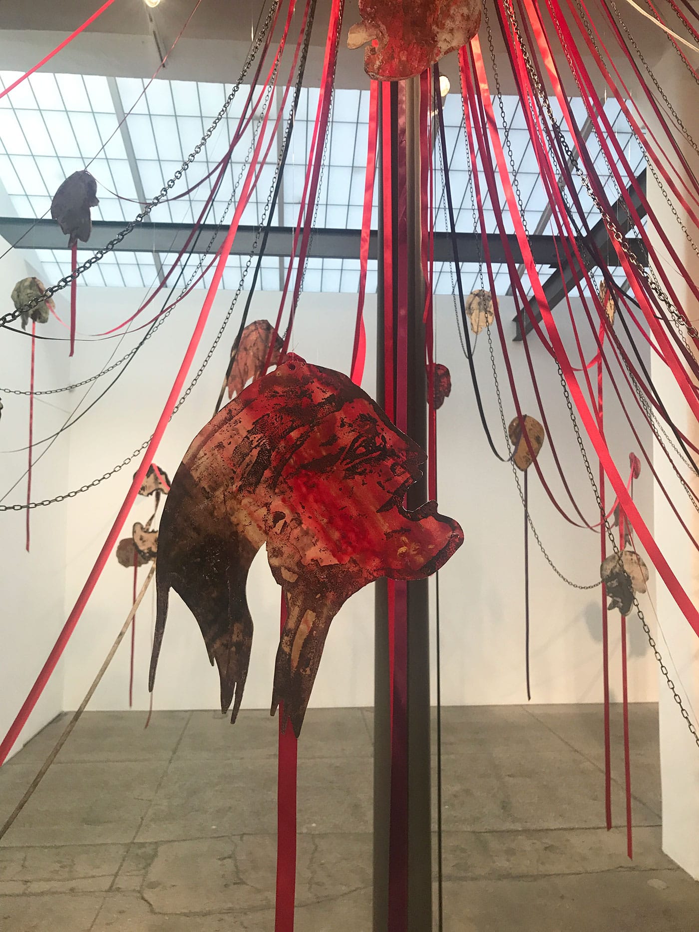 When Spero returned to her maypole idea, 40 years later, the Iraq War was raging. The United States was replaying its leading role as an agent of death and destruction. This time, Spero would literally build the pole and drape the ribbons and create the heads. The viewer would be forced to physically encounter and negotiate the spectacle of violence, which the work instantiates not only in its overall form, but also in the bright red resonance between the festive ribbons (accompanied by some chains) and the bloody heads. The faces, hand-printed on aluminum, have an aged, almost mythical quality to them (one seems to be bleeding from its eyes, like Oedipus), as if they’d been ripped from some decaying, ancient text. Yet their extended tongues and pained facial expressions make their agony seem visceral and real. Maypoles are traditionally erected for festivals that gather communities to celebrate spring or summer; historically, executions and lynchings have also been events that bring people together. What does it mean, Spero asks, for war to be a ritual? How do we confront the brutal fact that violence is part of who we are?