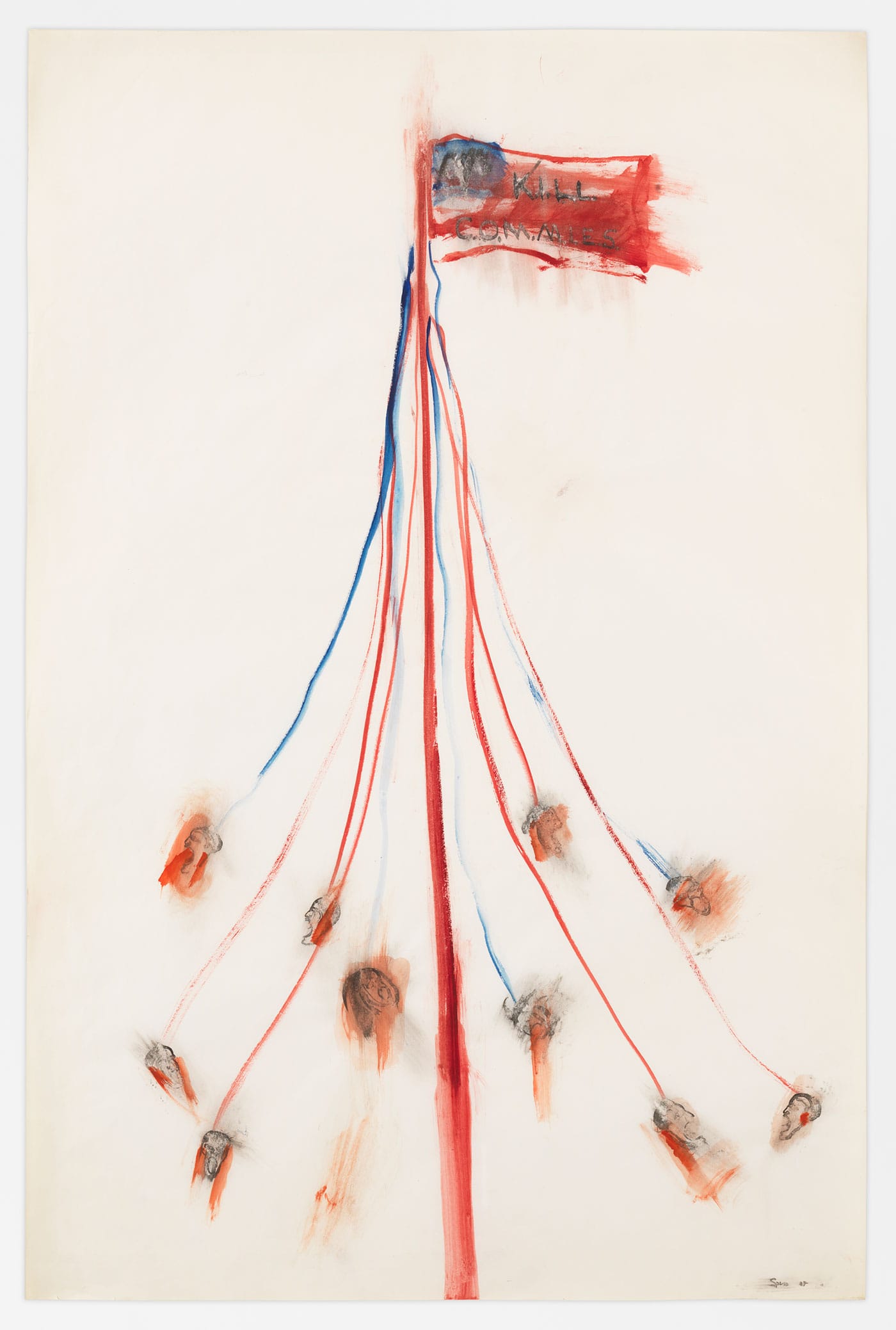In one painting on paper, “Kill Commies / Maypole” (1967), Spero has rendered a central red pole with red and blue strings hanging off it, all ending in decapitated, gaping-mouthed heads. At the top of the pole flies a blurry American flag whose red stripes seem to have become a bloody mass, on which the titular text “Kill Commies” is written. Although it’s a finished painting, the work has the feeling of a sketch — a way to capture the hastiness with which the killing was being done, as well as Spero’s own anguished reaction. (“Maybe the strongest work I’ve done is because it was done with indignation,” she once said.)
