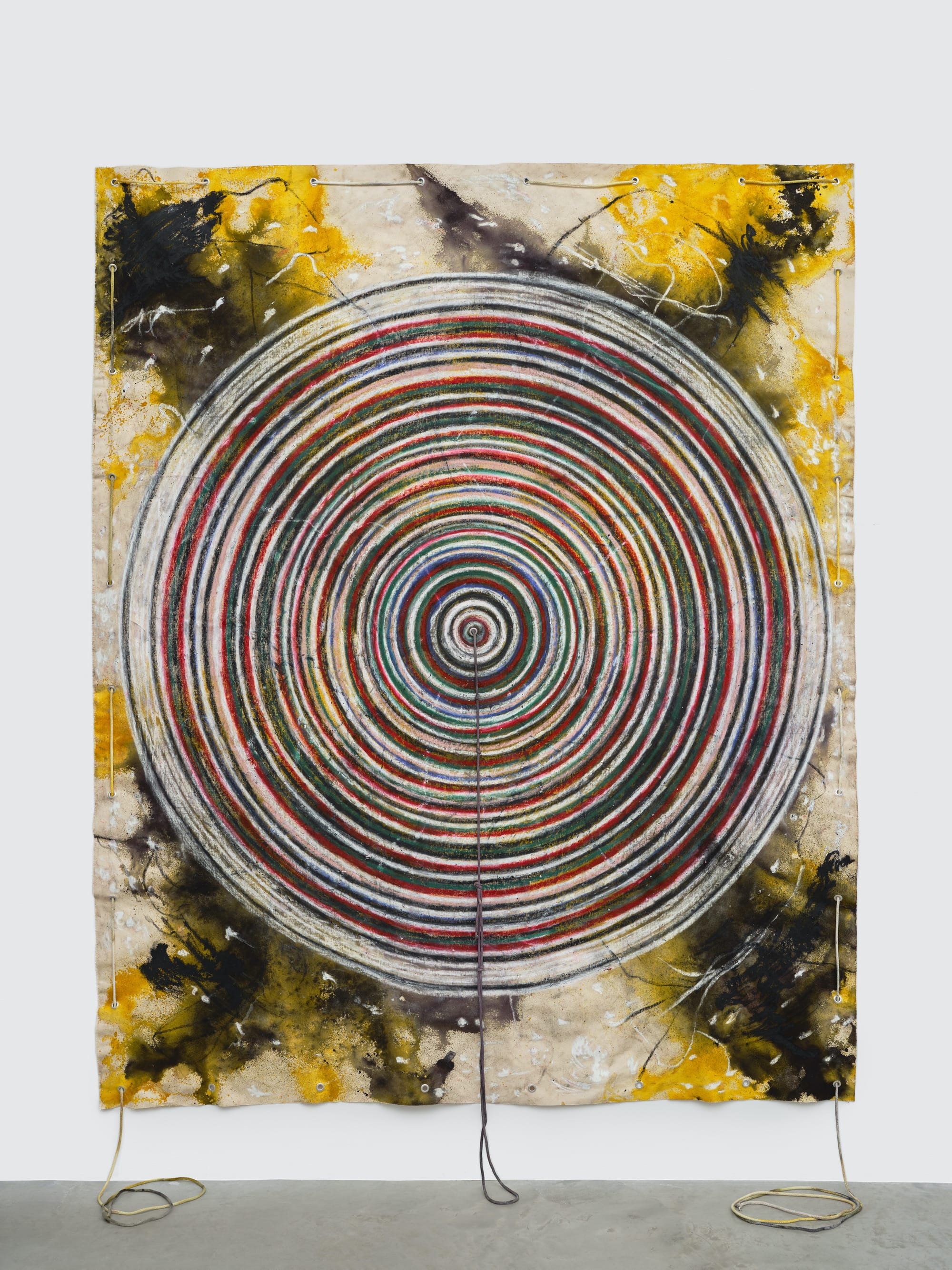 In the four large, unstretched canvases, two of which have two large, precisely cut circular openings and all of which have rope and grommets threading the surface, Hiro literally gets inside the painting by standing with one leg through each hole and uses the ropes to pull up the canvas and wrap it around himself. By spraying fabric dye into the opening, he uses his body to paint. As he paints and draws he cannot see what he is doing. This action might be repeated over time. In addition to the fabric dye, he uses oil pastel and other mediums to makes accretions of shapes and marks.
