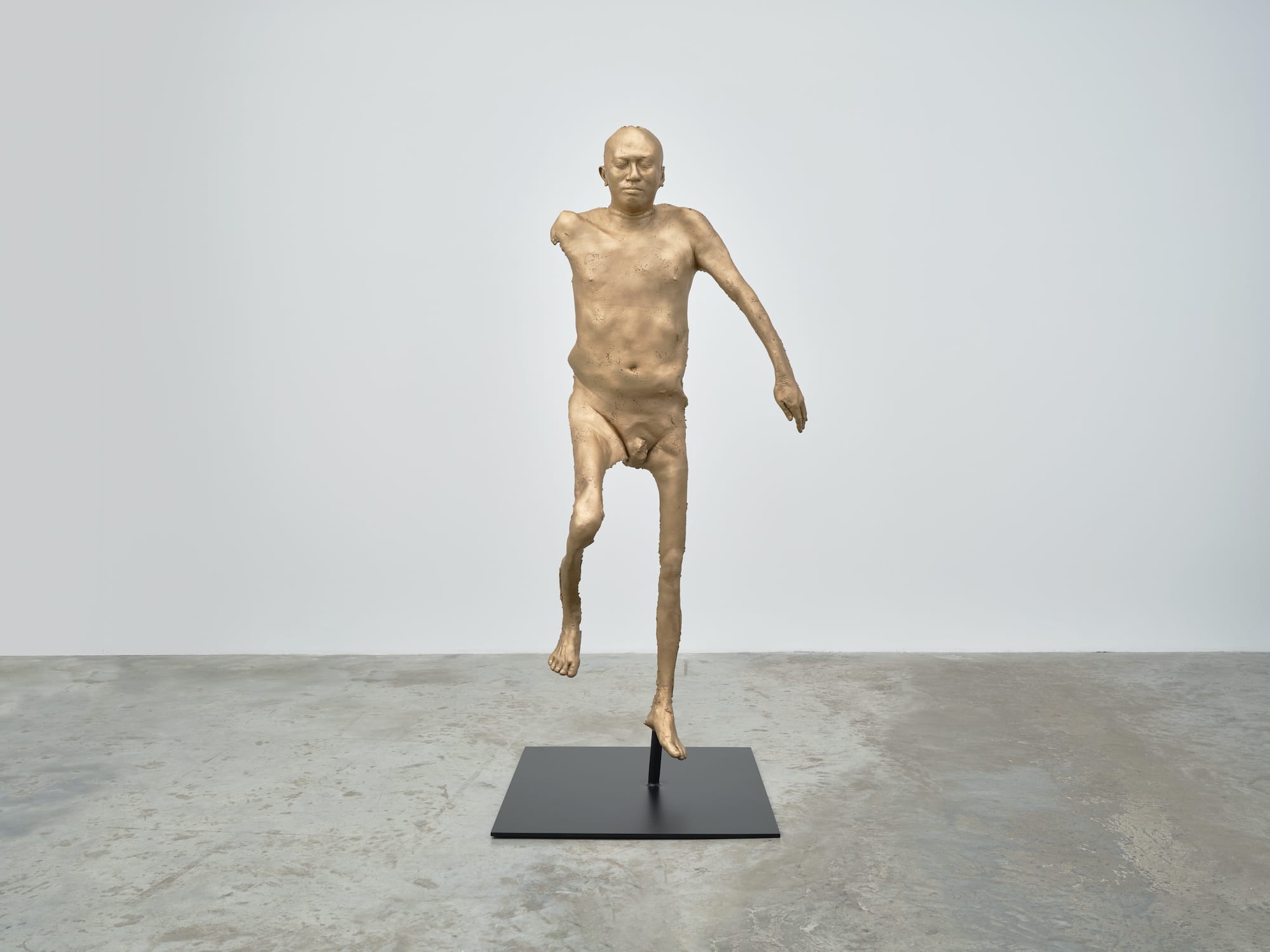 The difference is that Hiro’s exacting performative process evokes restraint and limitation, which inflects the work and the experience of viewing it. This is most evident in his sculptures, for which he is always the subject. In “Sandman” (2022), he pours silicone over his body, covering himself with it. He has to freeze in his position until the silicone dries. After extricating himself, he casts the silicone skin in bronze. The result is unsettling, partly because the right arm that Hiro used to pour the liquid silicone is missing, while the record of the body’s topography denies idealization.