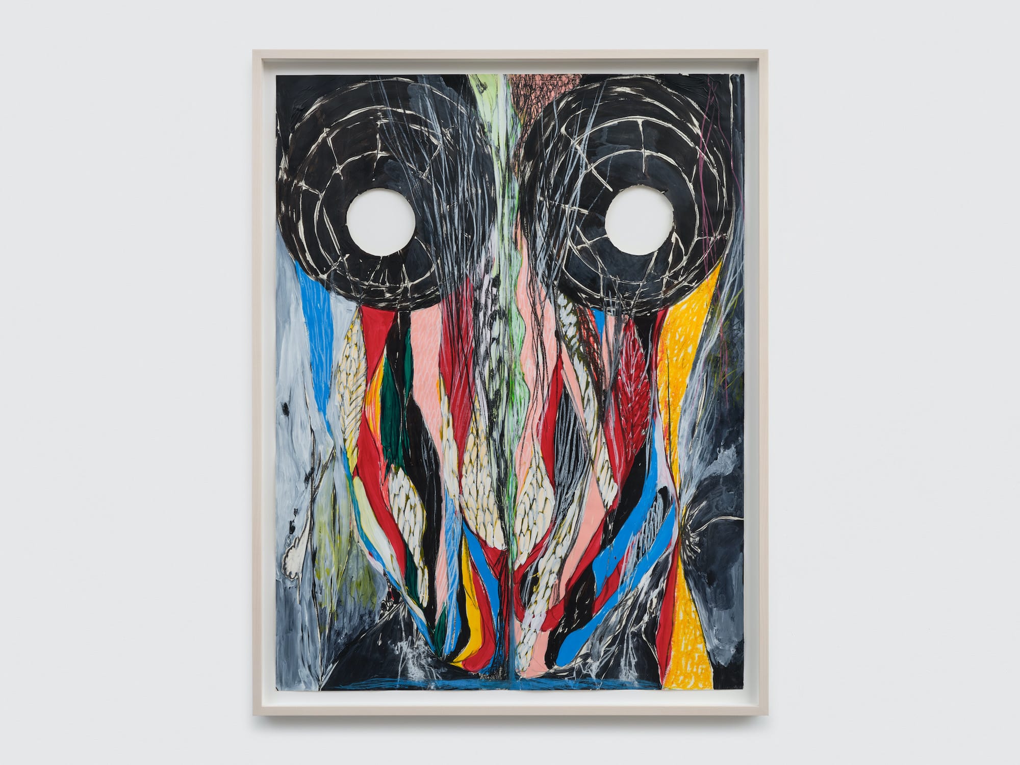 In order to make the paintings on wood panels, he lies underneath them, like a mechanic on a creeper rolling under a car. A handful of similar actions and images can be found in all of these paintings: a large cluster of vertical gouges made along the vertical axis of the painting; leaf- and plant-like shapes, often dark red; flat, black, scale-like shapes. We can also see vigorous repetition, wandering lines, linear clusters, green abstract shapes, and a peachy-pink one. The gouges can evoke all kinds of feelings, from frustration to anger to a sense of absurdity. The shifts in medium, marks, and color all exert an emotional pull. When Hiro is underneath the painting, only about two feet separate him from the work’s surface, which means his view of the painting is partial. He can easily see and work on what is directly in front of him, but he cannot step away and survey the entire work.