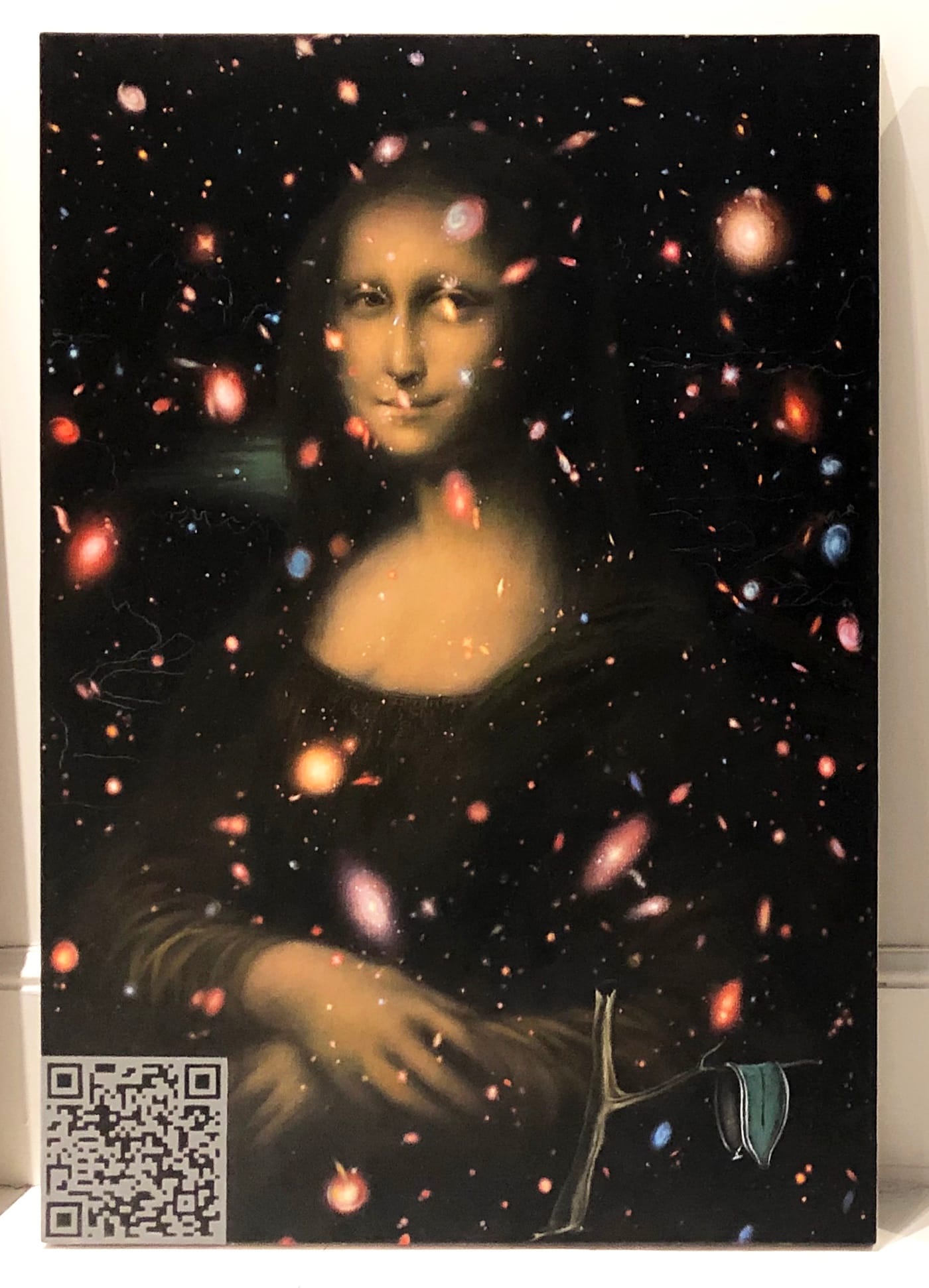 “Touching Deep Space” (2018), with its melting Salvador Dalí clock, shows Leonardo’s enigmatic sitter emerging like a celestial apparition among the stars and planets, with a painted QR Code that links to the website of the Hubble Space Telescope. The mountainous landscape in the background of “Double Your Pleasure” (2018) comes from a Guo Xi painting; the artist has also included a dinosaur (a tyrannosaurus) and three playful young people, painted twice, who give the picture its title, which comes from the old advertising tag line for Wrigley’s Doublemint chewing gum.