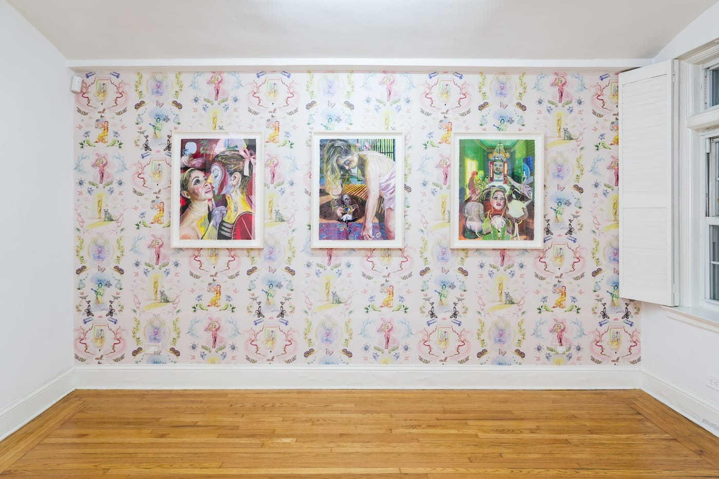 The juxaposition of the wallpaper — with clichéd images of innocence and growth — and the drawings of O is really what Frank does masterfully. She transports the viewer to an alternative reality that is unsettling, theatrical, dream-like, seductive, weird, and disembodied. Looking at her work, we go down the rabbit hole.