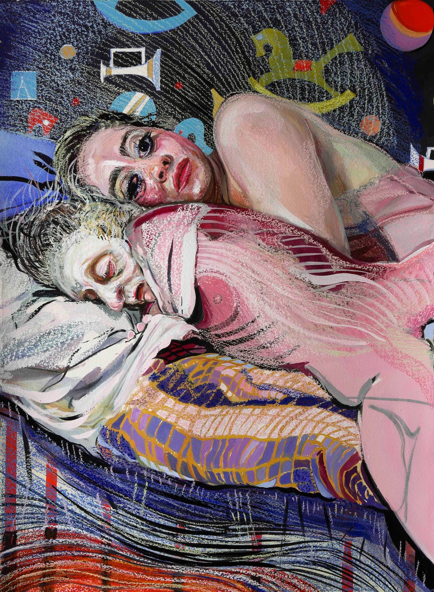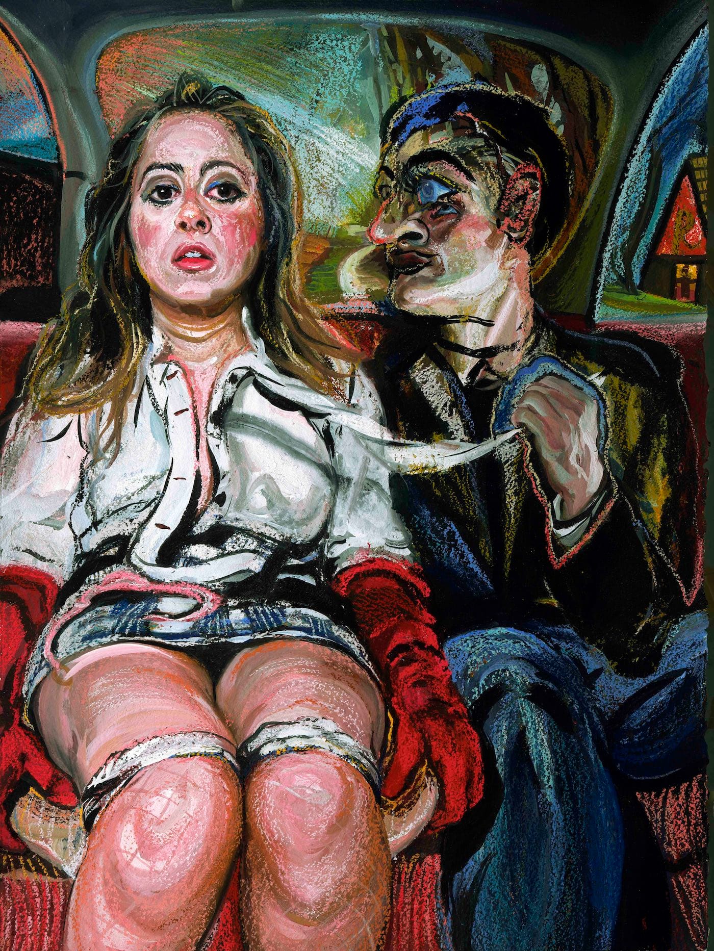 The first work the viewer encounters is on the landing at the top of the stairs leading to the gallery. We see a wide-eyed young woman with a pink, scrubbed face and long brown hair seated in the back seat of a car. A man, whose exaggerated features are highlighted in green, electric blue, and salmon-colored pastel, looks at her as he holds a white strip from her unbuttoned blouse in his hand, like a leash. Although they sit beside each other and she seems to be at his mercy, Frank’s deeper point is that they exist in separate worlds. She suggests this through her use of color (the woman is wearing white while the man is wearing black highlighted in blue) and her attention to gesture and expression. There is a look of longing on his face, while hers conveys a glimmer of apprehension.