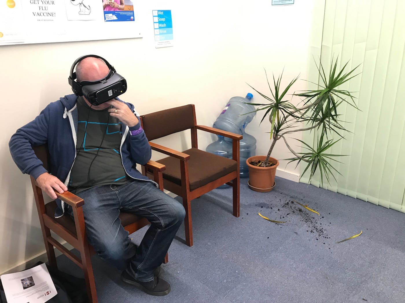 It is here we sit before donning our headsets, a setting familiar to all who rely on public healthcare. Alarmist posters around the wall act as memento mori before you even step into the film. A potted plant has spilled some earth onto the carpet, and a television, clamped to the wall, runs a 24-hour news feed. Death is never far away on the news, after all.