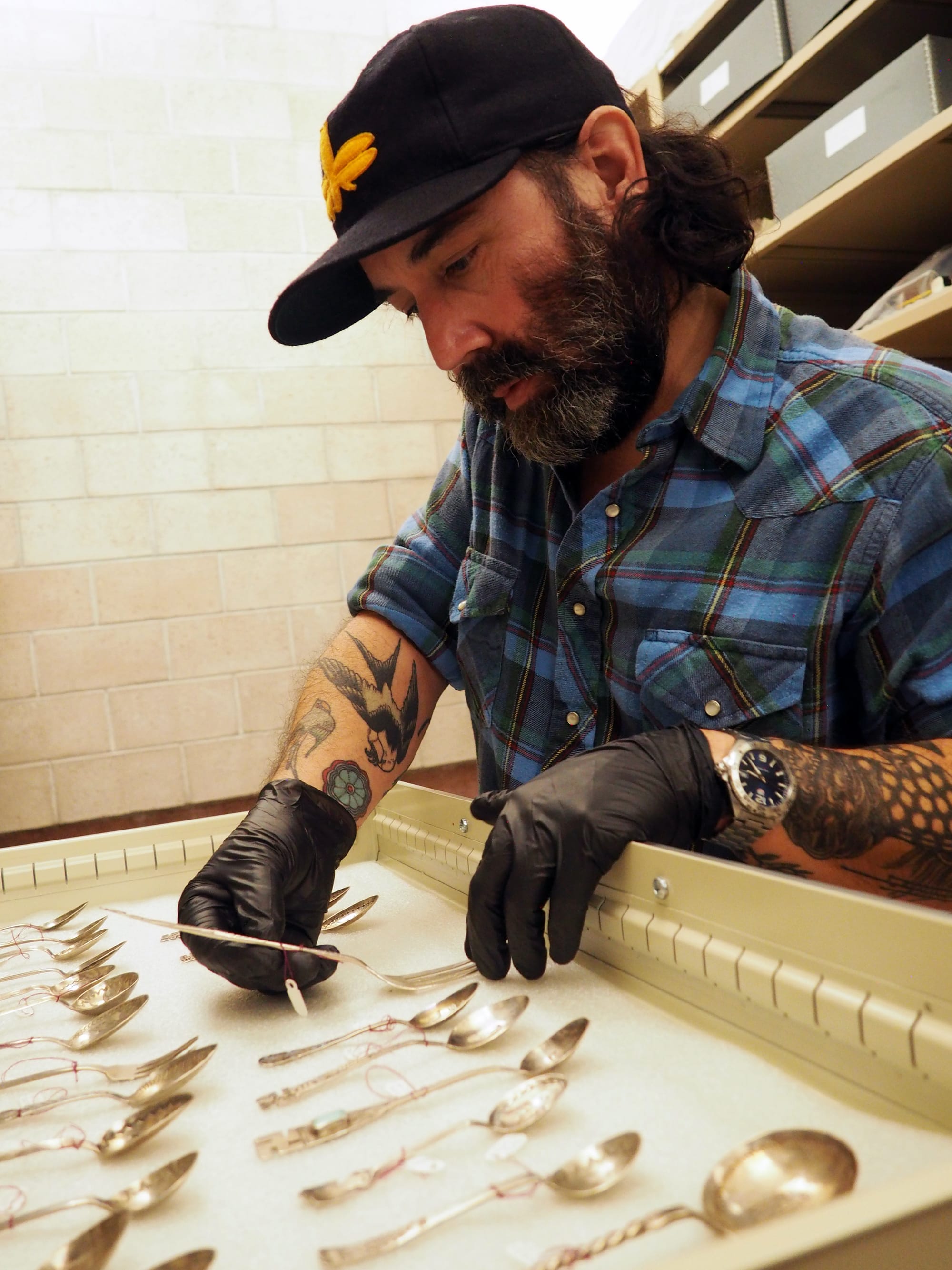 Over the years, the museum’s collection has been built of pieces from Native and non-Native people. Young’s focus on silver intensifies a symbolic reading of the material: silver’s shine indicates beauty, strength, and value, while its tarnish results from either use or neglect. By selecting pieces with engravings, patterns, and designs, and other details signifying craft and labor, he draws attention to the ways art moves and works. And he reminds us that there are multiple kinds of knowing, learning.