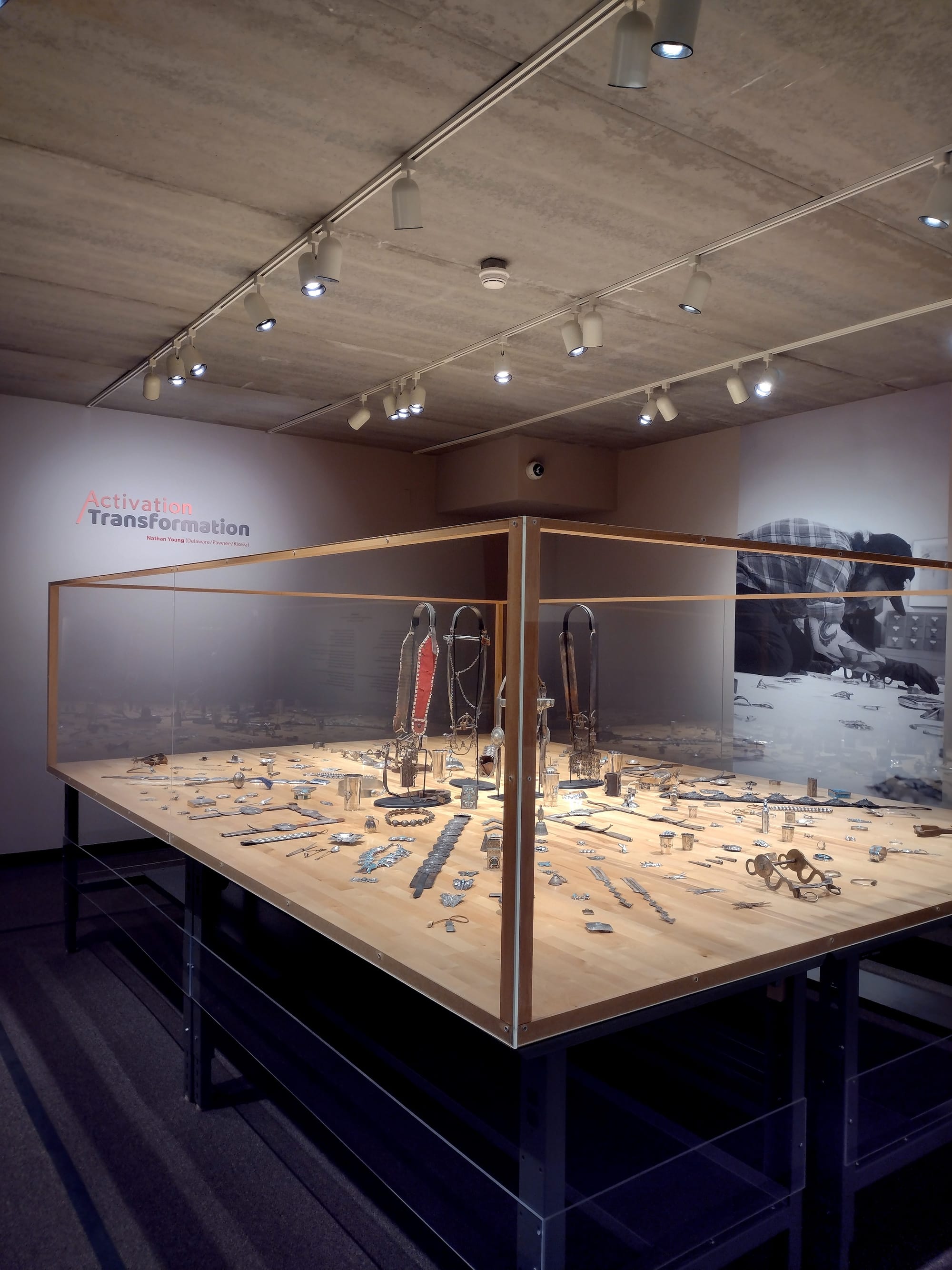 Activation/Transformation harbors a myriad of stories, some known, some never to be. Bridles, tools, bow guards, belt buckles, utensils, cigarette holders, jewelry, and other objects of personal adornment, care, and function, ranging from the 19th century to the present, are presented in a visually dynamic display on a rectangular tabletop, protected by plexiglass. The composition, though abstract, is akin to the Zia sun symbol; horse work objects concentrate at the center while other objects radiate outward as directional indicators of traveling, identity, and placemaking.