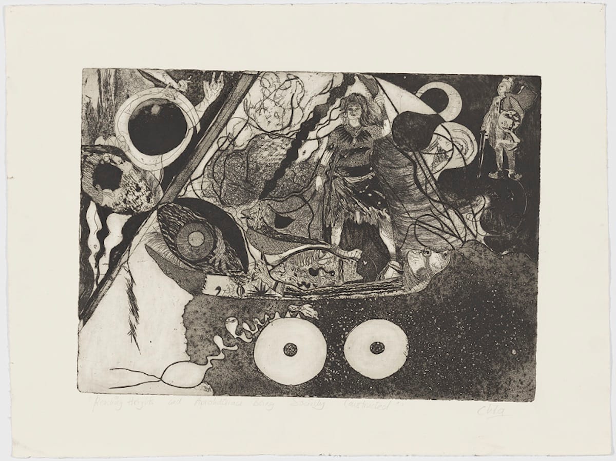 Finally, Burman’s "Aphrodisiacs Being Socially Constructed" (1988) is an etching and aquatint print that represents the artist in two roles: one lying down face-up on the ground, and another face-forward in the posture of a woman warrior. Surrounding her are shapes suggestive of eyes, hair, breast, and sperm. Taken together, the cumulative portrait is one of fragmented, dissociative womanhood.