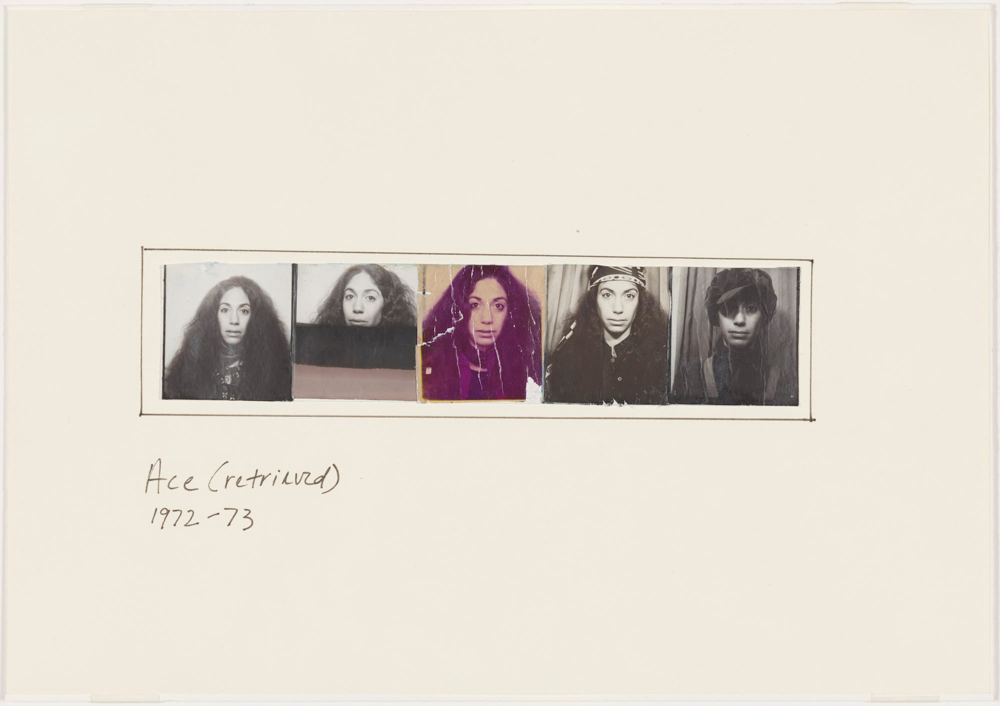 Hiller’s "Ace (retrieved)," a sequence of self-portraits belonging to The Photomat Portrait Series (1972-3), shows the artist playing with costumes and accessories in a photo booth. Hiller, who died in 2019, had attributed her affection for photo booths to the reversal of roles between the artist and the subject, as the latter traditionally assumes a more passive role in being portrayed.