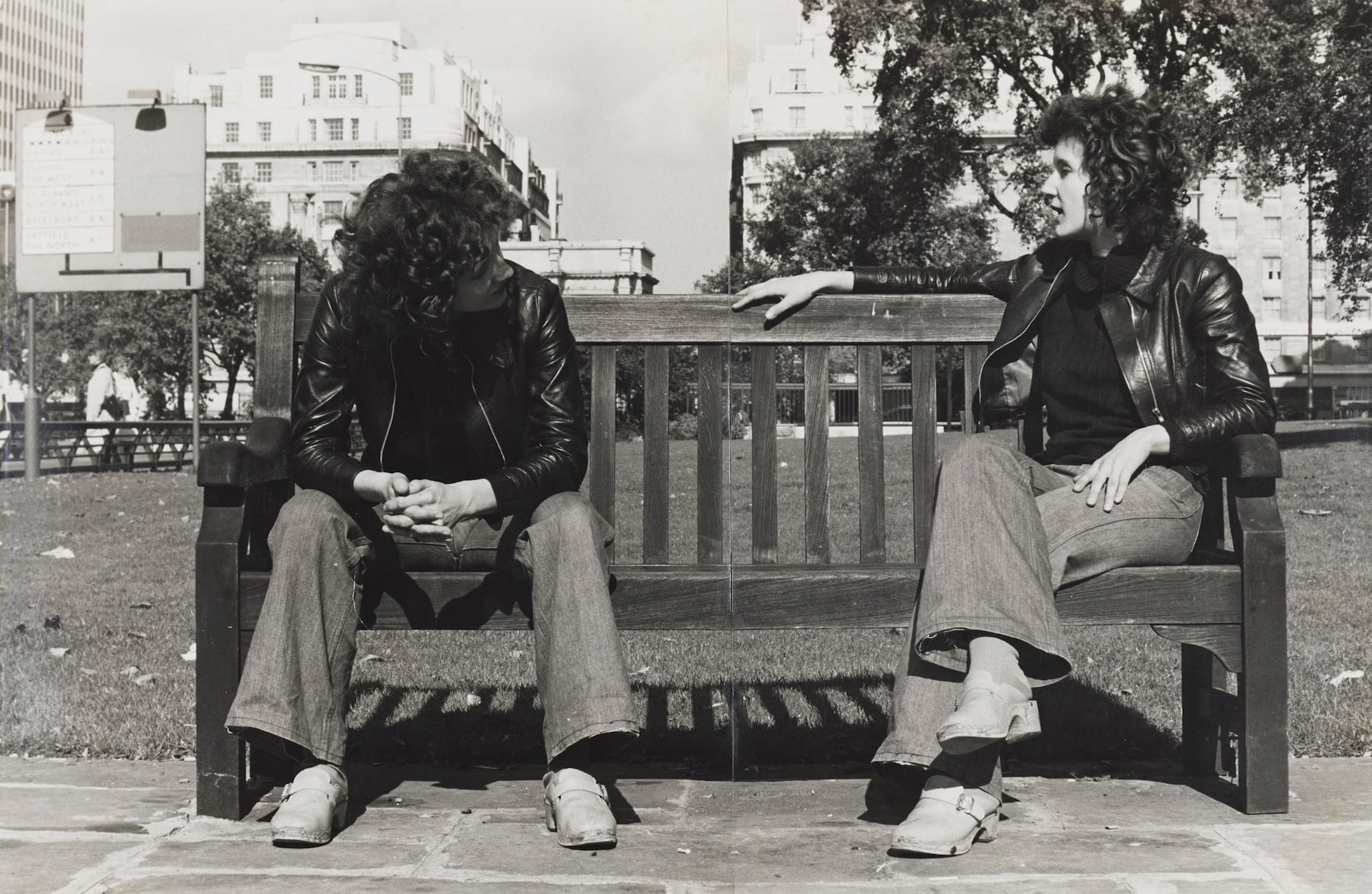 Finn-Kelcey’s "Preparatory study for ‘Divided Self’" (1974) is a collaged photograph of the artist engaging in conversation with herself on a bench at Speaker’s Corner in Marble Arch, London. That's where historical figures like Karl Marx, George Orwell, and Vladimir Lenin have spoken and debated publicly on their ideas. Finn-Kelcey’s work draws attention to the tenuous position that women occupy in public space and their marginalization in political life.