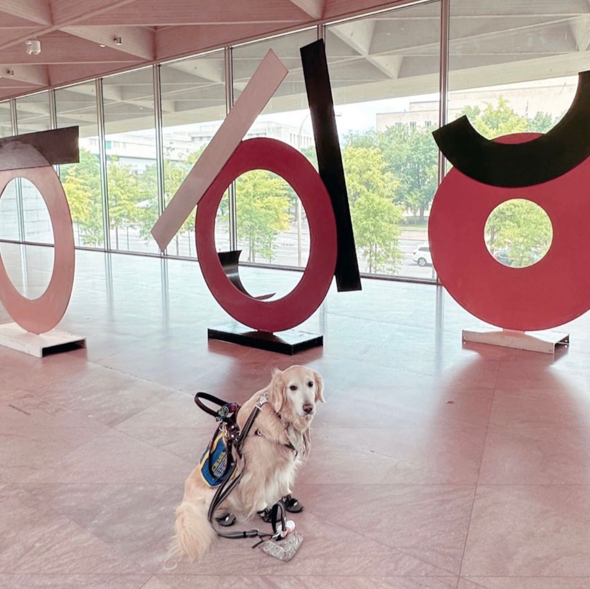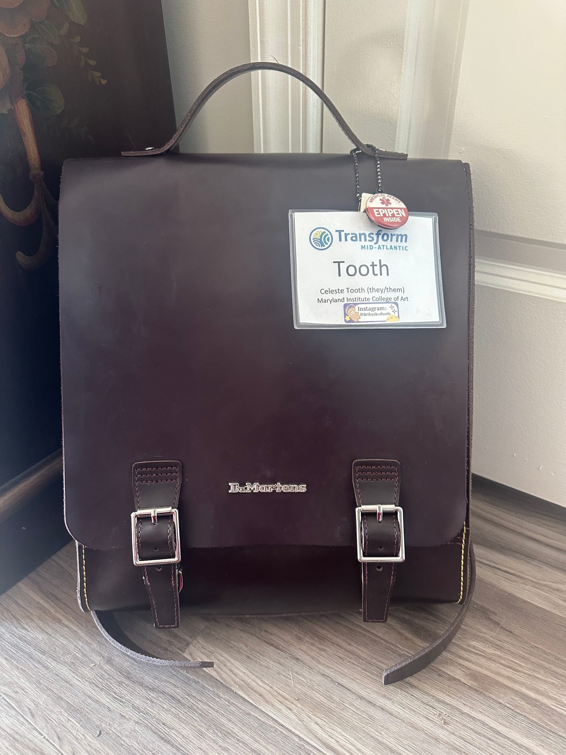 Tooth explained that their bag holds emergency medication that prevents them from having episodes that can lead to strokes, as well as other equipment including epipens and catheter supplies. Tooth said that after their third neurosurgery for lipomyelomeningocele spina bifida, their doctor told them to wear the bag on two shoulders so that they don't fall. Tooth was accompanied by their service dog, Willow, who is allowed in the galleries under museum policy.