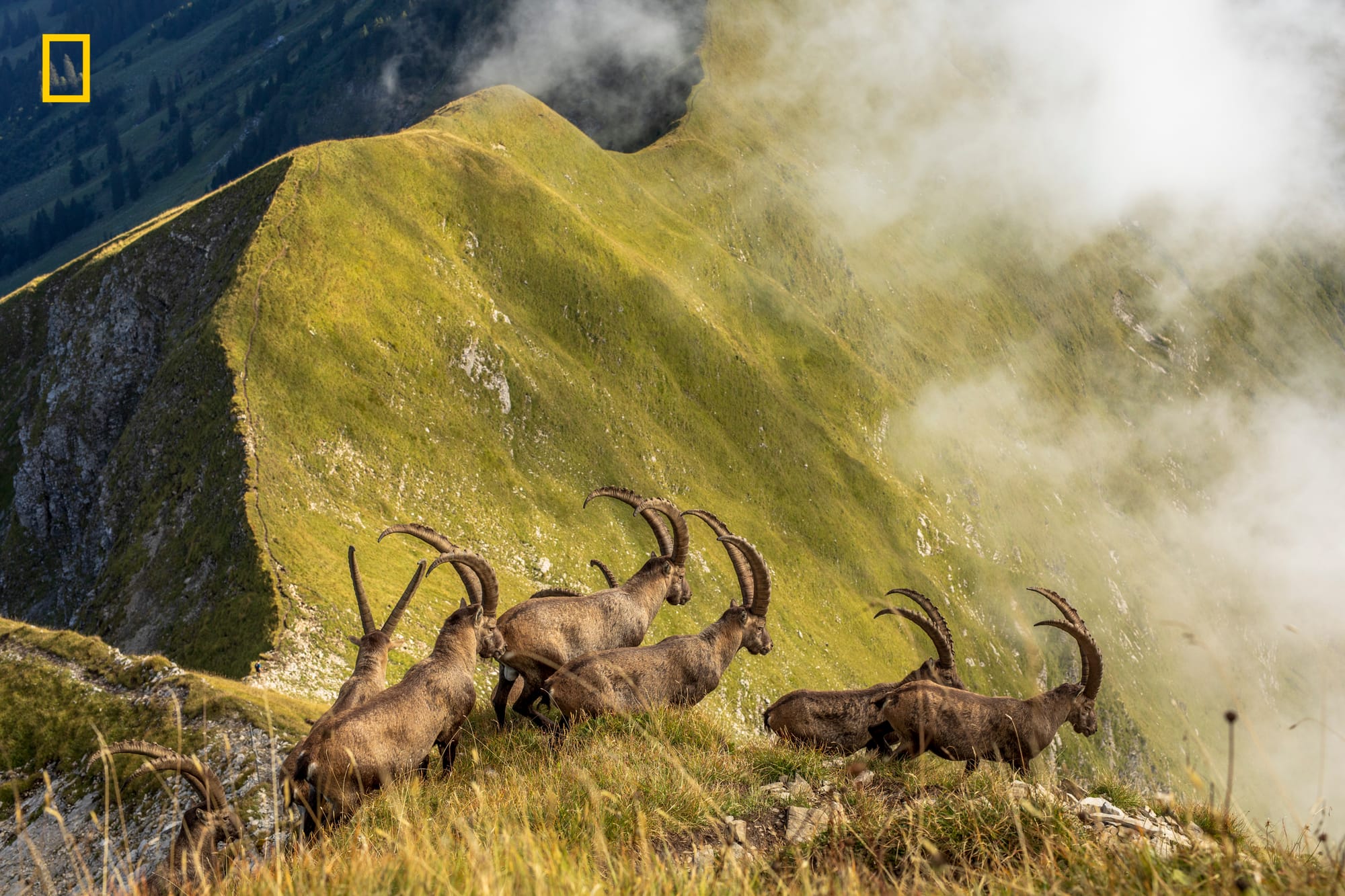 “A herd of ibexes in Switzerland’s Bernese Oberland cross a ridge above Lake Brienz. Their powerful and impressive horns show who the king of the Alps are. Ibexes are ideally adapted to live at dizzying heights. The continuing ridge path and the rising fog show the natural habitat of these animals. After a few hours of observing the animals, I spotted the ibex herd on one side of the ridge. Several ibexes stopped at the transition [to view the world around them].” — Jonas Schäfer