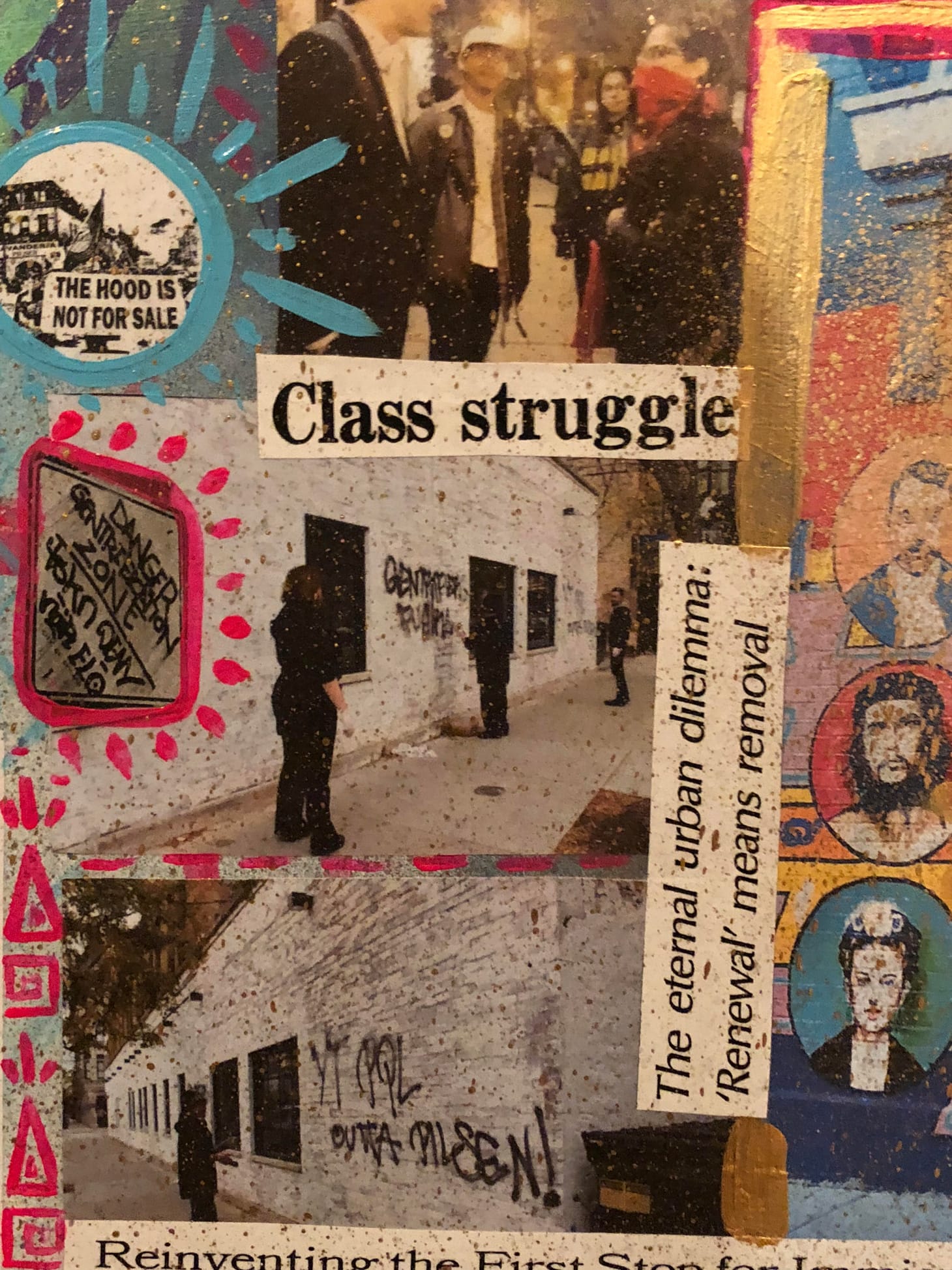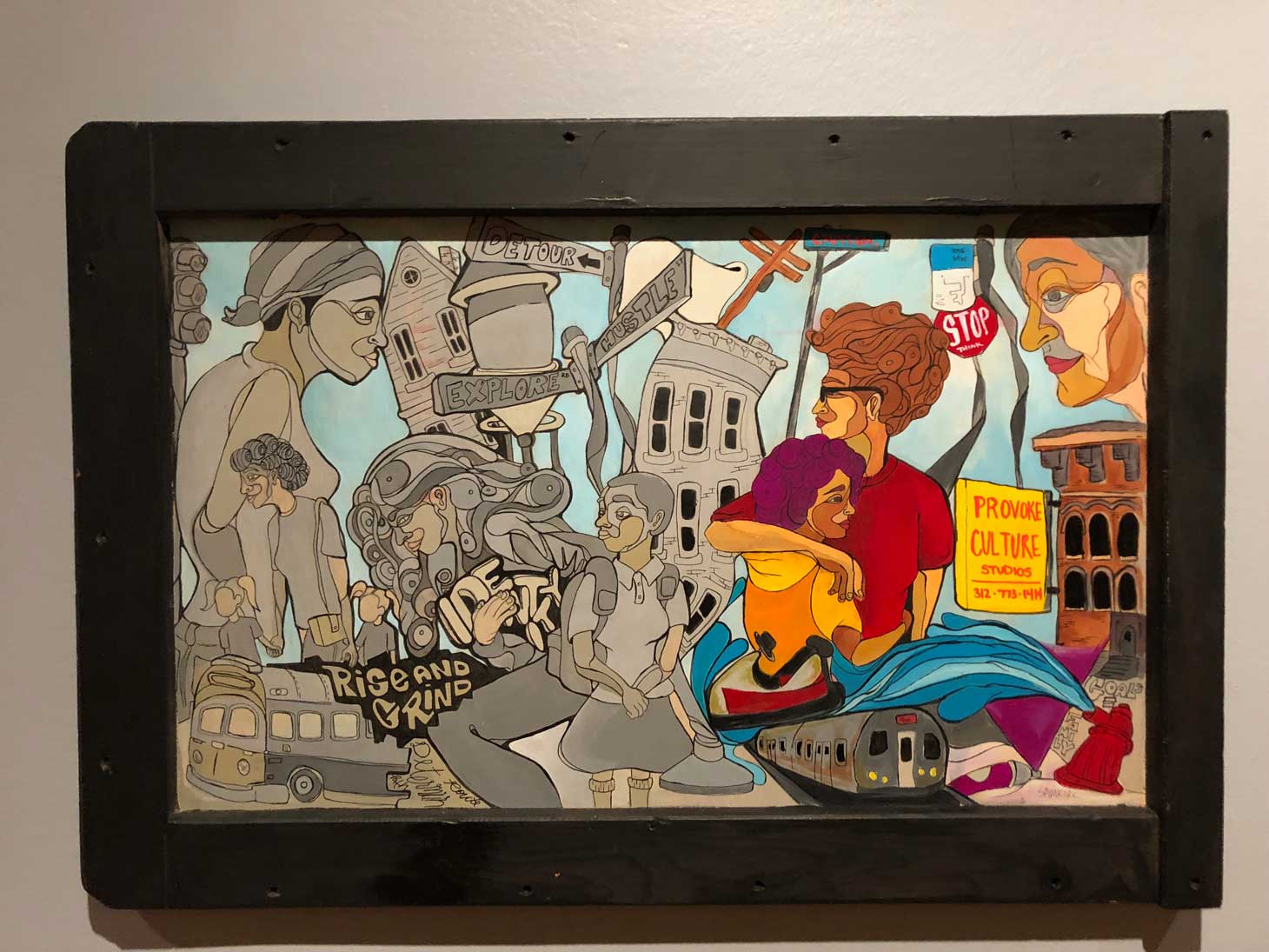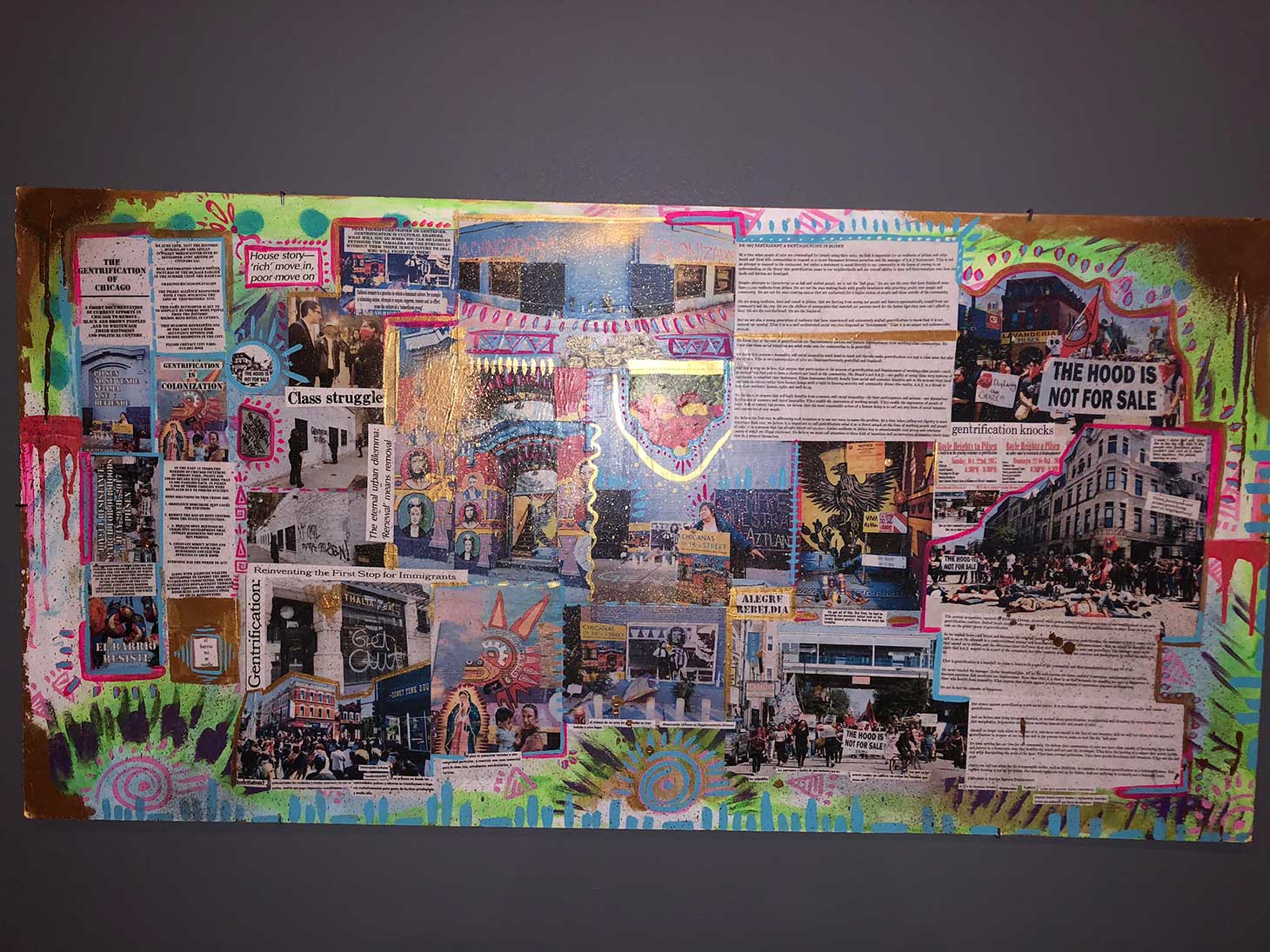 The only other work in Peeling Off the Grey to utilize photography is that of Rebel Betty, a self-identified “AfroBoricua visual artist, educator and organizer from Chicago.” The mixed media work on wood panel, titled “Summer of Joyful Resistance,” collages images taken from newspapers and other printouts, placing them next to photos of famous Pilsen locations and moments of protest between 2017 and 2018. The piece quotes articles surrounding resistance to Pilsen’s gentrification, compiling a textual, photographic, and aesthetic landscape for an entire year of a community’s life. Featured prominently is the facade of the infamous Thalia Hall, as well as the interior of some of Pilsen gallery spaces.