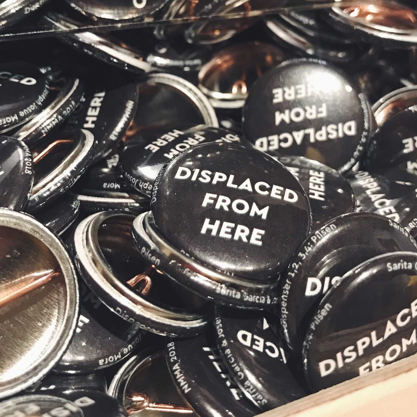 A collaboration between Sarita Garcia and Joseph Josué Mora makes visible the markers of gentrification, as consolidated into a brief but loud button meant to be worn by gallery patrons. The installation, “Dispenser 1, 2, 3, 4: Pilsen 2018,” offers a tactile expression of how visible gentrification makes one’s history in relation to space. The station features a small sign tucked beneath the center of the four aligned dispensers, requesting patrons take the pin they most identify with and begin a conversation about their relationship to Pilsen and its gentrification. The four options denote “Raised Here,” “Not From Here,” “Displaced From Here,” and “New Here.” As one thinks through these signifiers and one’s direct relationship to their real-world implications, their reality becomes haunting. There is a specific violence in living parallel to one’s colonizer while being expected to be grateful for their “renewing” presence. I say “colonizer” here to evoke anti-gentrification community organizing, which has reframed urban development through the lens of colonization given the many economic and cultural similarities between the two extractive practices.