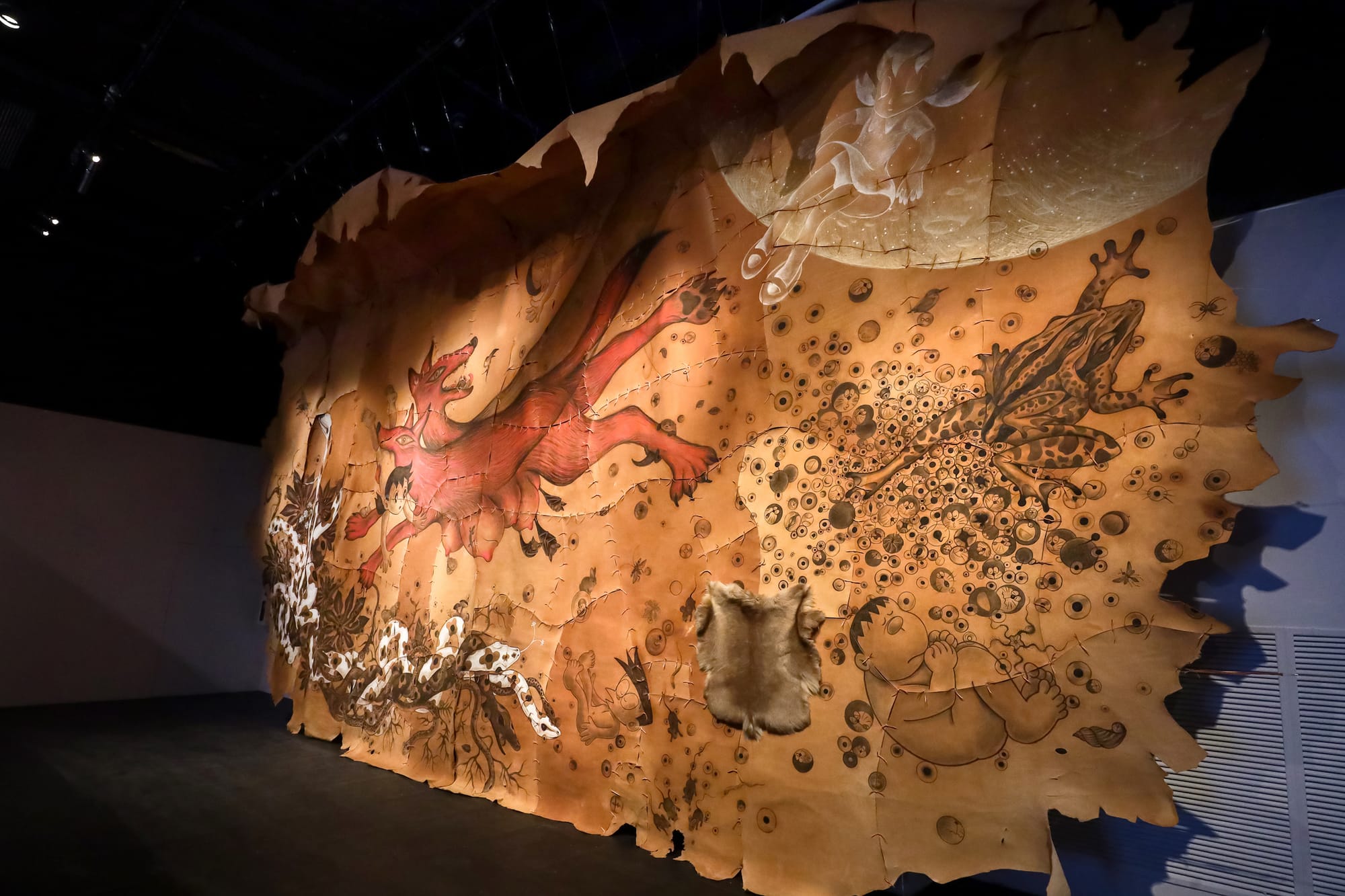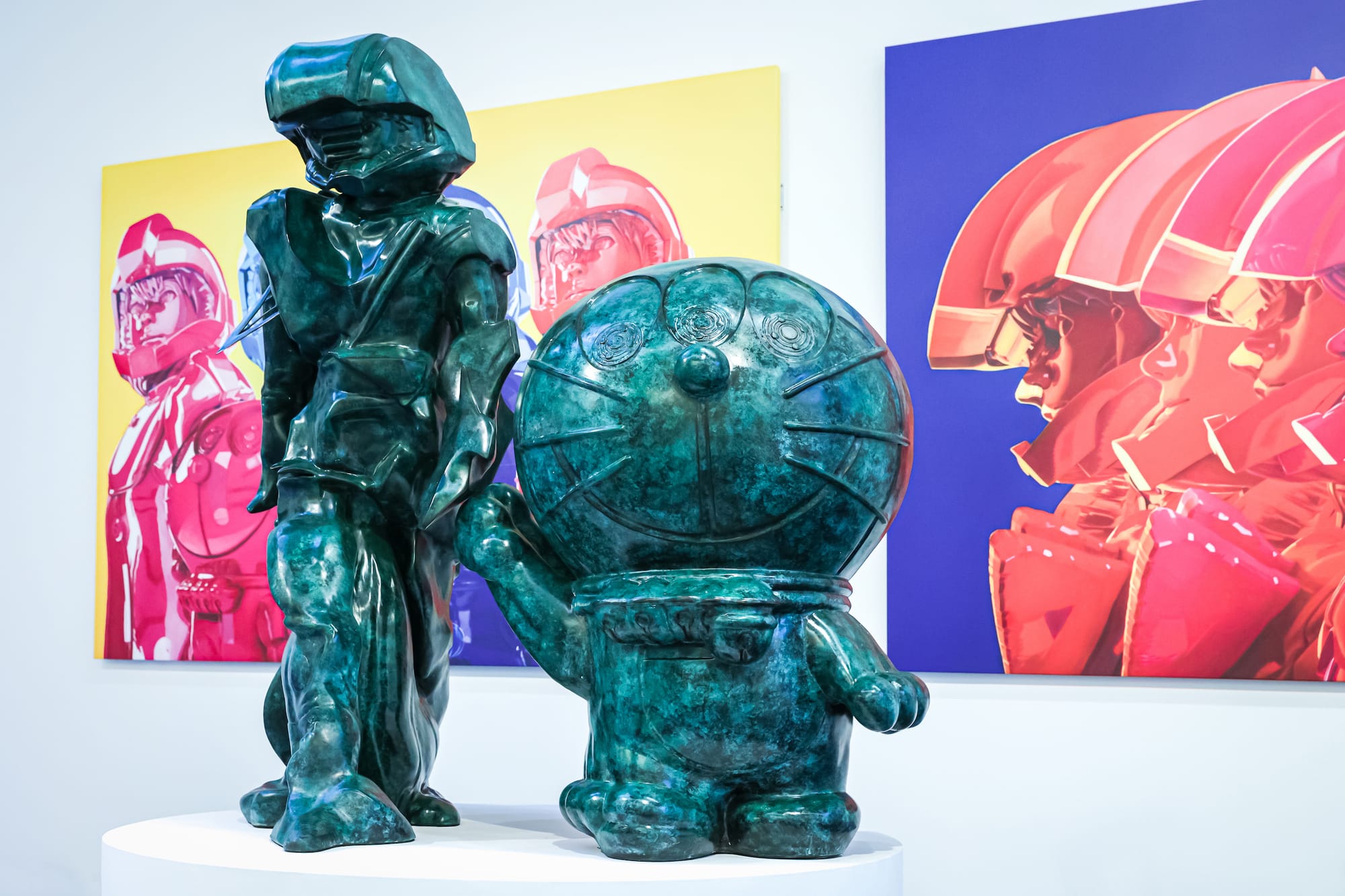 Doraemon’s massive cultural influence is evident in the section of the exhibition that showcases work by 28 leading contemporary Japanese artists, among them Akinori Goto, Tomoko Konoike, Sebastian Masuda, Takashi Murakami, Yoshitomo Nara, and Mika Ninagawa. Some artists responded to the prompt “Create Your Own Original Doraemon” while others chose to interpret the character through references to their favorite Doraemon movies, such as Doraemon: Nobita’s Adventure into the Underworld and Doraemon: Nobita and the Kingdom of Clouds.