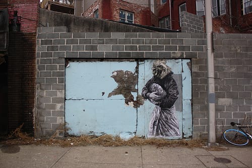 An important component of this piece and all great street art is time, which differentiates the art from more conventional gallery work. As the image weathers and the two tones of newsprint used in the piece age at different rates, the human and animal forms will separate visually from one another. The tenuous unity here will slowly dissipate. Even when the image is fresh, the nuanced and hand-drawn lines of the human form are contrasted with the stark printed lines of the rooster head. The animal head shows the characteristic printing plate breaks that exist in all Gaia’s large linoleum prints. These cracks in unity humanize Gaia’s images and shatters any illusion of perfection. It is in these crevices between parts that humanity seeps in. It is the space in between that remains of interest. It is impossible to meditate on a flawless wall, Gaia seems to say, it is the flaws that allow us to focus and see new possibilities that were not obvious at first, and it is in these flaws that human nature, no matter how bizarre, is revealed.