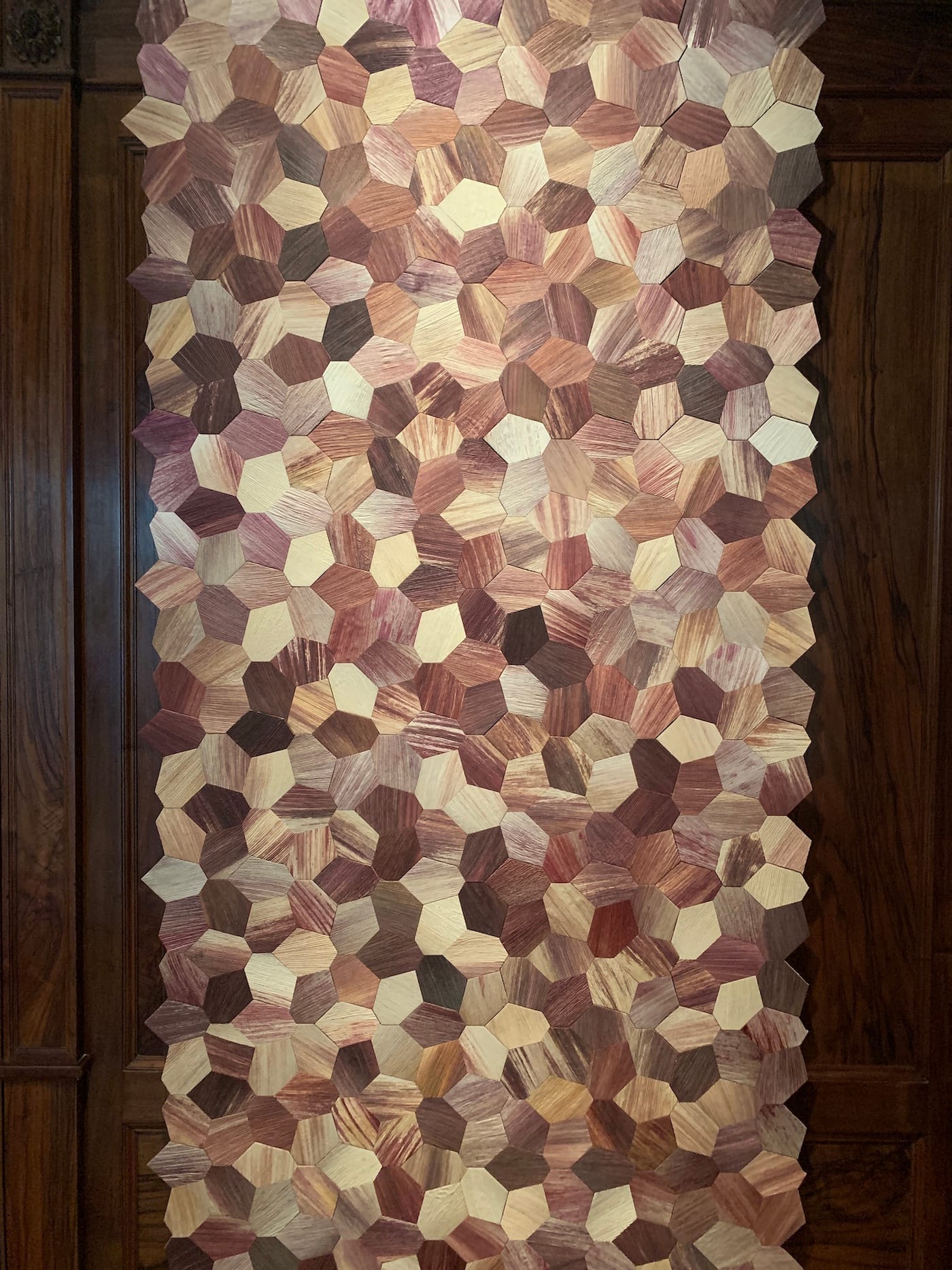 Death becomes a source of innovation for other exhibitors. Shrimp shells and fallen leaves build the body of “Aguahoja II” (2017–19), an amber cellulose exoskeleton robotically manufactured by a Massachusetts Institute of Technology lab and designed by Neri Oxman. “Totomoxtle” (2017–ongoing), a marquetry material by Fernando Laposse, draws its hexagonal tiles from the husks of heirloom corn native to Mexico. Shades of purple, red, and orange lend decorative appeal to a project that attempts to revive traditional agricultural practices in the country by employing Mexico’s vulnerable indigenous Mixte people, who grow corn in the southwestern state of Puebla. In a global economy that urges farmers to plant cash crops above all else for survival, Laposse is incentivizing a return to this historical ecology.