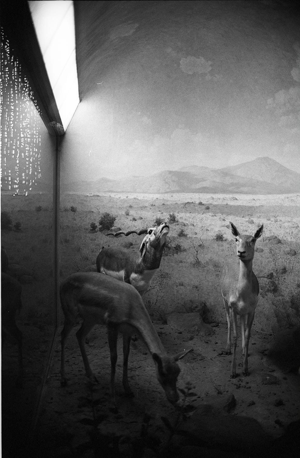 Dead animals also appear in the photographs of Natalie Conn — but they are meant to look alive, and eerily, they do. While Bird seems interested in preserving the transitory order of nature, Conn draws attention to the artificiality of preservation itself. Dioramas are designed to transport the viewer, to make them forget the lights, the cameras, the captions. But Conn, in many of her photographs, deliberately includes the structures of the diorama itself, as if to remind us that human encounters with nature are often constrained and circumscribed, corralled behind curbs, fences, glass. Her photographs represent nature twice tamed — first by the diorama, then by the camera.