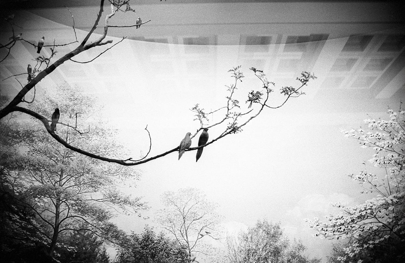 In “Band” (2018), three antelope appear to gather calmly in a patch of savanna, but a wall cuts through the image like a seam. Similarly, in “Branch” (2018), taxidermy birds sit in postcard-perfect poses, on an artfully-arranged tree. But at the top of the frame, thanks to a reflection on glass, the museum’s ceiling is visible, reminding us that the photograph — like the diorama — was constructed within rigid constraints. These are depictions of depictions of nature; even the photograph, hanging on the wall of Prospect Range gallery, is behind the glint of glass. Conn’s photographs are modest but thoughtful, encouraging us to pay closer attention to our unnatural relationship to the natural world.