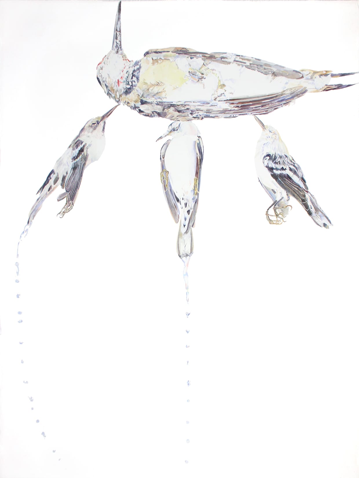 But neither artist ultimately seems won over by the scientific gaze. In Bird’s painting “Condensation” (2003), three birds appear to curl up against a larger bird, like ducklings against their mother. But any sense of peacefulness is deceptive. The birds are not so much lifelike as lifeless: this is how birds look when they’re splayed out on the sidewalk, or after they’ve struck glass. Water droplets, rendered with amazing attention to color and shape, drip from two of the birds, guiding the eye through the white space around the birds.