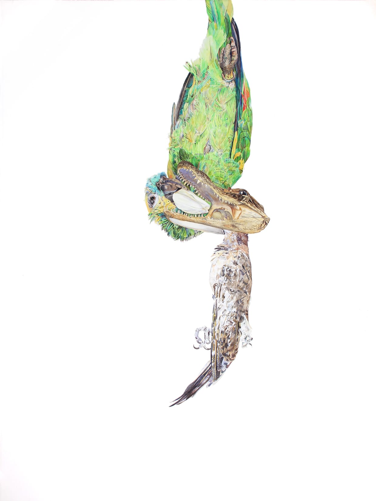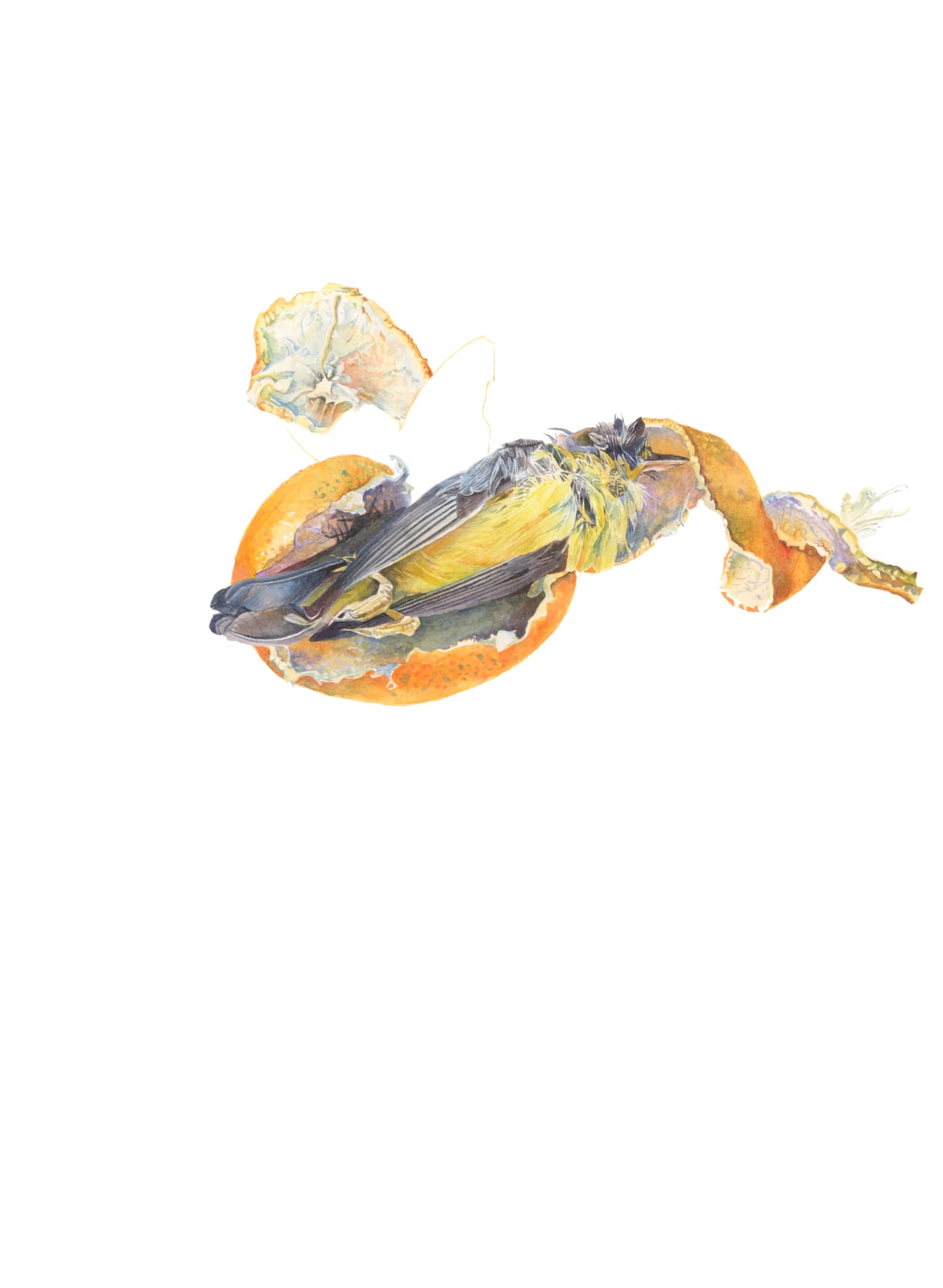 Such calm depictions of death, in such a careful composition, suggest that Bird may be trying to capture something that is slipping away. Not the birds themselves, but the intricate structure of nature, before insects, microorganisms, and humans have had a chance to break it down. Bird often takes walks to find birds to paint; some of them presumably die after hitting cars and buildings. While she paints them, using a number 4 watercolor brush, they apparently change as they stiffen and dry out. One might be tempted to call the birds specimens, but Bird’s paintings are too sensitive for that.