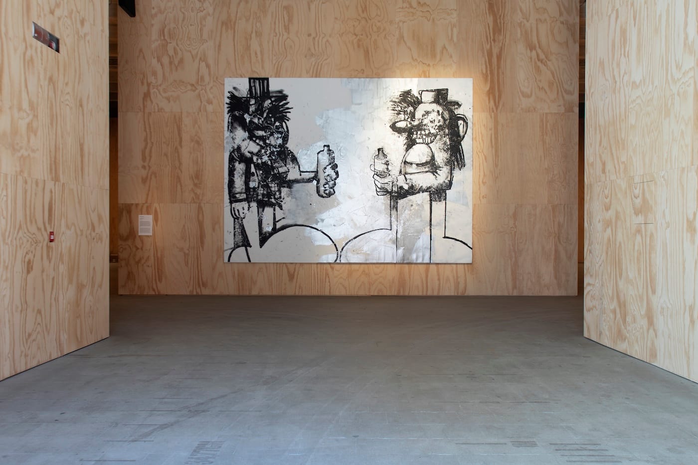 The best National Pavilion was Martin Puryear’s Liberty, the official United States presentation. In five white-walled galleries as well as the entrance courtyard, Puryear dealt with this political theme through works such as “Tabernacle” (2019), an enlarged version of a Civil War military cap, with a glass window on top, so that you can see your reflection inside the crown, and “A Column for Sally Hemings” (2019), a stake mounted on a classical Doric column dedicated to Sally Hemings, the enslaved African American and mistress of Thomas Jefferson, who fathered children with her. And, my favorite, “Hibernian Testosterone” (2018), for which the artist mounted the skull and antlers of a great Irish elk on an upside down cross. One sculpture, “New Voortrekker” (2018), which featured a cart modeled on those used by the South African Voortrekkers and in 19th-century American wagon trains, is overtly literal. But the rest of these works are highly effective.