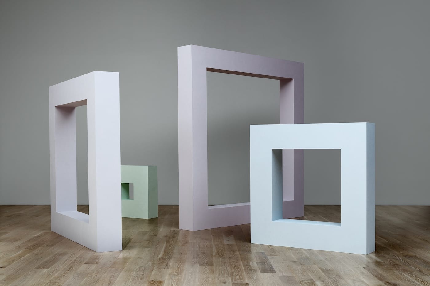The exhibition begins with “Sunset Squares” (1965/2018), a group of minimalist sculptures made of plywood covered with acrylic on canvas. Four large freestanding volumetric squares of different sizes, painted in warm whites and pastels are placed at adjacent angles. Together, they form an open Cubist complex. In their imperfect alignments, they appear to propose a challenge to the formal prison of the Modernist grid, becoming instead, windows looking upon an imaginary landscape to conjure up a Freudian chimera of escape.