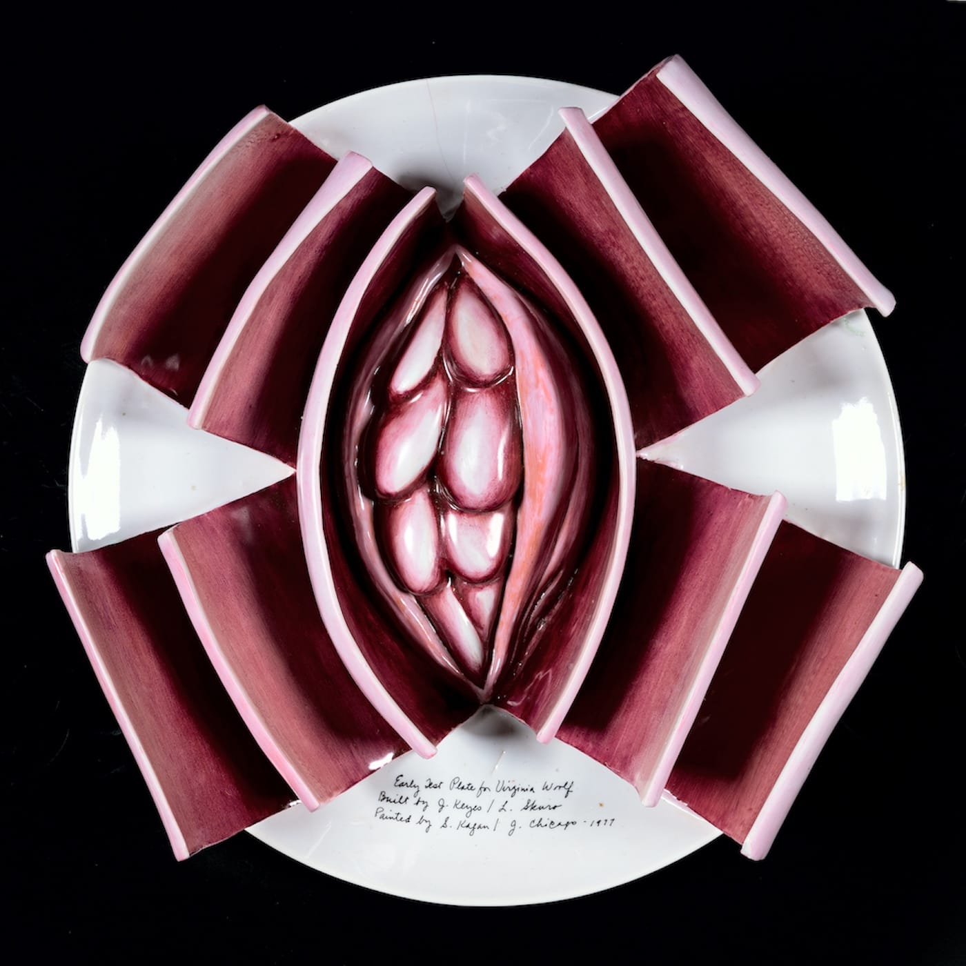 The exhibition underscores the extent to which Chicago is more than just her magnum opus, “The Dinner Party” (1974–79). This monumental and groundbreaking work, which has been on permanent display at the Elizabeth A. Sackler Center for Feminist Art at the Brooklyn Museum since 2007, honors real and mythical women who were erased from history by virtue of their gender. Powerful women including Sappho, Georgia O’Keeffe, Sojourner Truth, and Susan B. Anthony are represented by elaborate place settings on a large, triangular table made through traditional “female” labor like needlework, ceramics, and china painting.