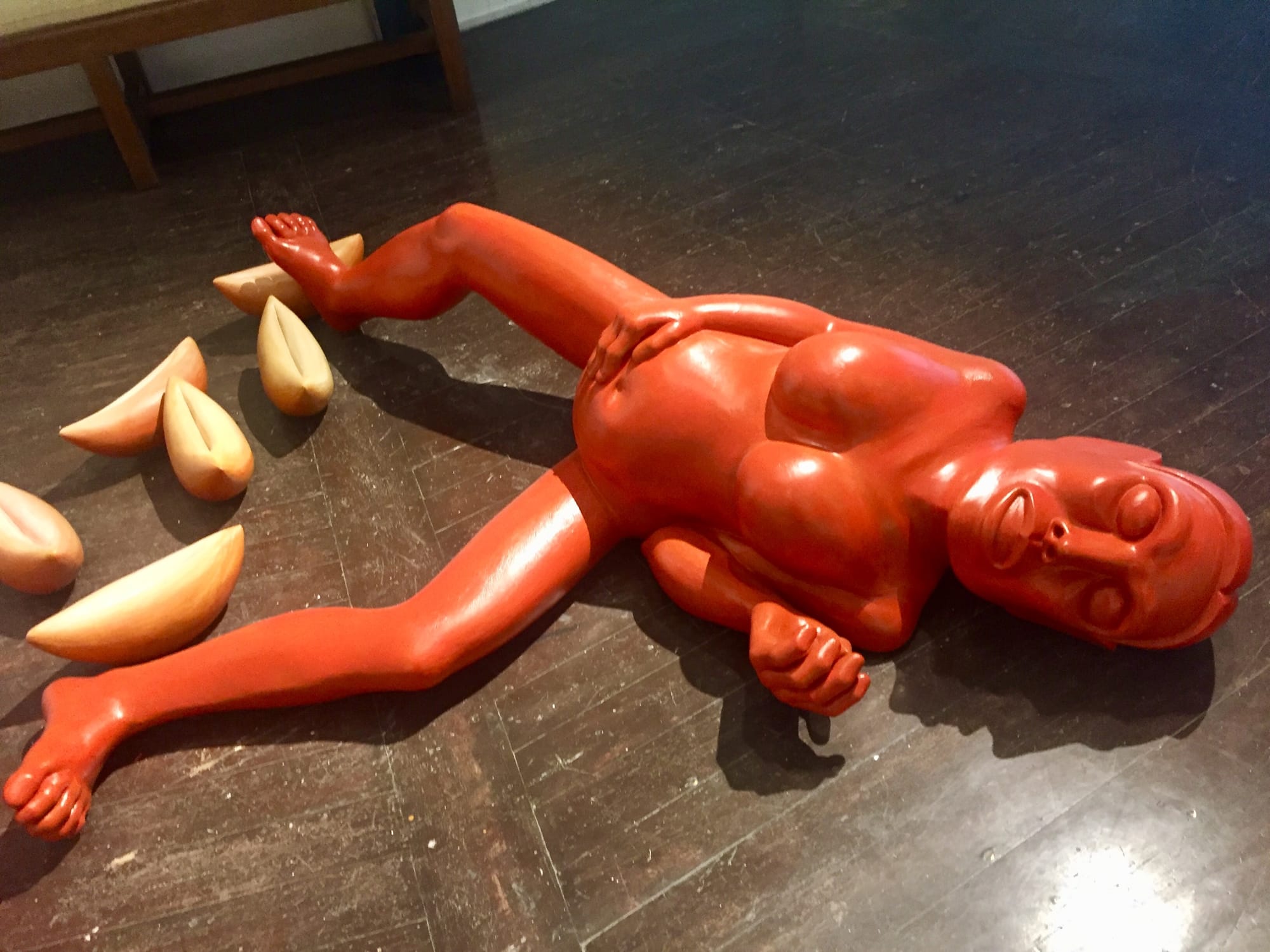 Navjot also addresses childbirth in a painful and powerful work, “Palani’s Daughters” (1996), by turning her gaze on the issue of female infanticide in India. It’s so widespread in rural parts of the country that sex determination in India has been illegal since 1994. A sculpture of a woman, painted bright red, lies splayed out on the ground among vaginal-shaped seed pods, her physiognomy contorted in pain. The interchangeability between ‘Earth’ and ‘Mother’ is obvious, with the Mother as the bearer of fruit and the primary agent of life. The work’s power is heightened by the color red, denoting the violence by which female agency, even in childbirth, is pried away in a patriarchal society.