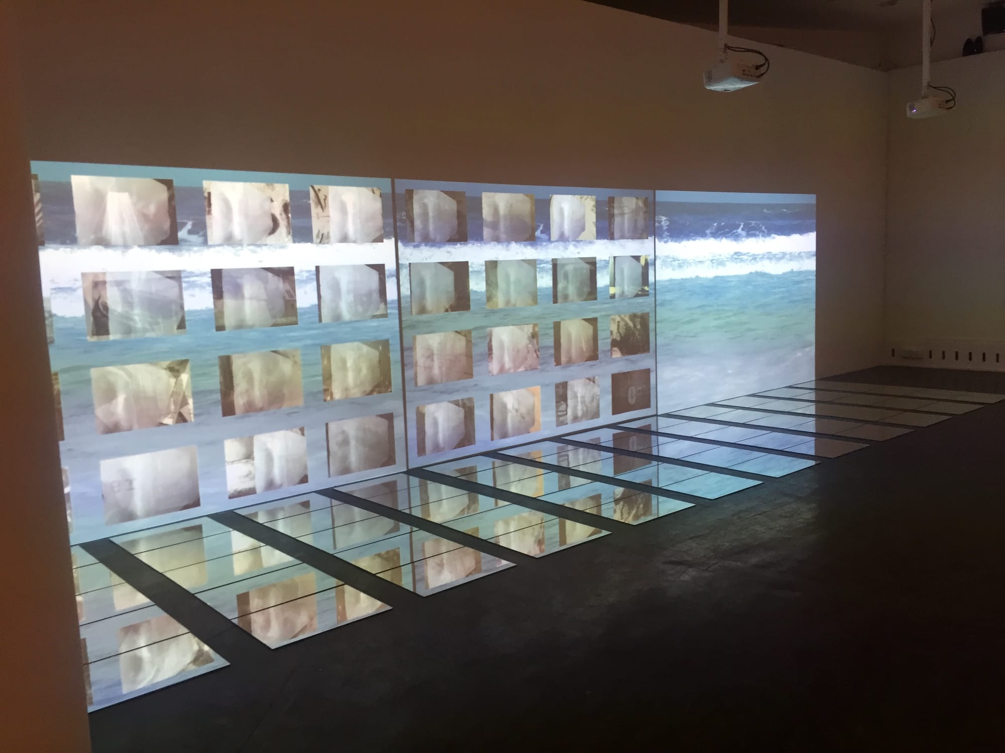The video starts with footage of large ocean waves, a lyrical, meditative scene reflected in the columns of mirrors placed in a grid in front of the projection, transforming the display into a kind of theater. Gradually, a grid of boxes starts to appear across the scene, like windows into micro-verses. On closer inspection, these boxes reveal blurred still and moving images, which turn out to be low-resolution newsreels of calamitous events, both recent and historical. At the end of the loop, the grid disappears, and the blue waves turn red, summoning a coda of violence and bloodshed. The use of the grid to comment on the abstraction of violence — and violence as an abstraction — is sublime, recalling Krauss’s lines evoking “This structure [the grid], impervious both to time and to incident, will not permit the projection of language into the domain of the visual, and the result is silence.”