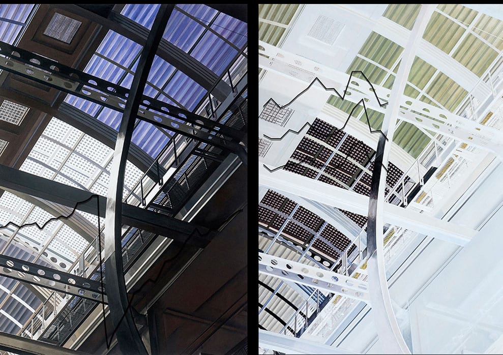 In a more recent work, “How Perfect Perfection Can Be” (2016–2017), Modernist architecture from around the world is abstracted as Constructivist forms, which are then finely painted in watercolor in graphic monochromes. Superimposed on these structures are chromatic emission graphs of carbon dioxide. They are pleasing to look at, both sophisticated and purposeful, until their sobering message is revealed. The subtle layering of visionary utopias, from New York and Munich to Beijing, with abstracted values of the planet’s demise through global warming draws ominous connections between modernity and hubris.
