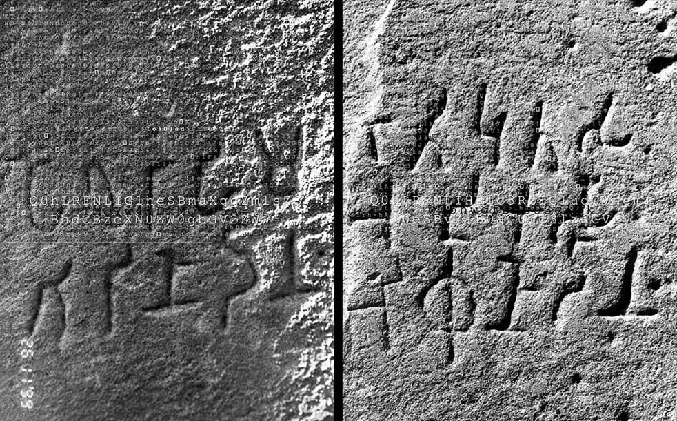 In her “Lost Text” (2017), Navjot turns a technical computer glitch that scrambled all her research into indecipherable code. The result is a series of abstract, monochromatic digital prints which resemble geological and archeological forms overlaid with scrambled typographies. The construction of knowledge requires language. But knowledge, deceived by language, becomes destabilized and illegible. This deceptively simple work identifies the existing chasm in translation and interpretation of female content. It reads as a kind of erasure, or at least, a displacement of knowledge and language.